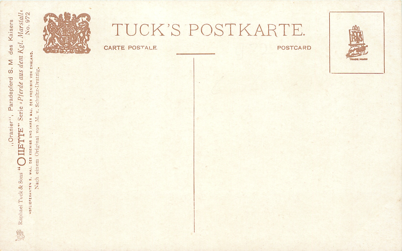 OILETTE, 2 backs, NACH EINEM ORIGINAL VON M. V. SCHULTZE-DRATZIG, same images German backs OILETTE 8681 RIDING-HORSE or PARADE-HORSE OF THE GERMAN EMPEROR