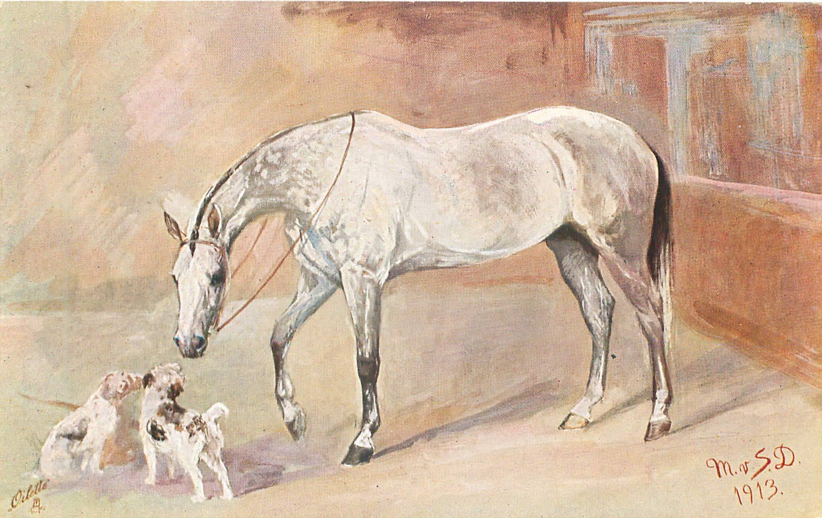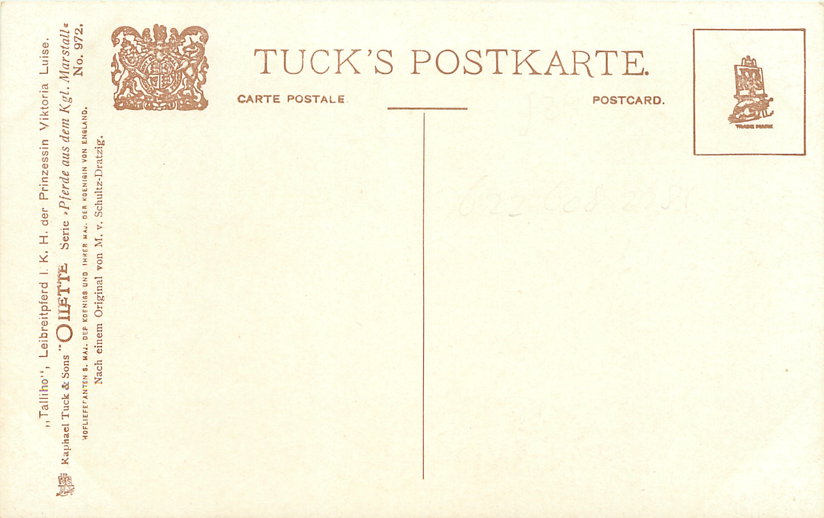 OILETTE, 2 backs, NACH EINEM ORIGINAL VON M. V. SCHULTZE-DRATZIG, same images German backs OILETTE 8681 RIDING-HORSE or PARADE-HORSE OF THE GERMAN EMPEROR
