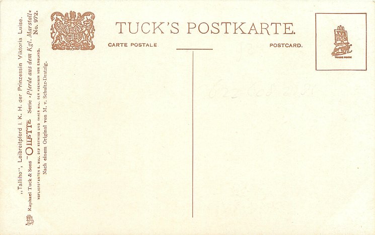 OILETTE, 2 backs, NACH EINEM ORIGINAL VON M. V. SCHULTZE-DRATZIG, same images German backs OILETTE 8681 RIDING-HORSE or PARADE-HORSE OF THE GERMAN EMPEROR