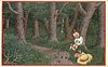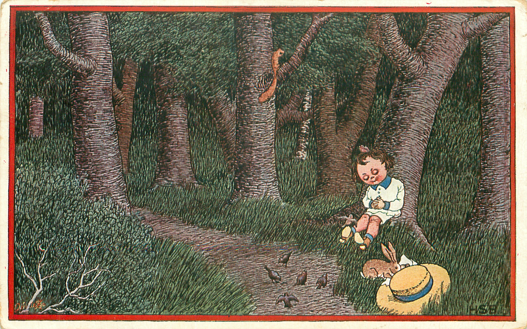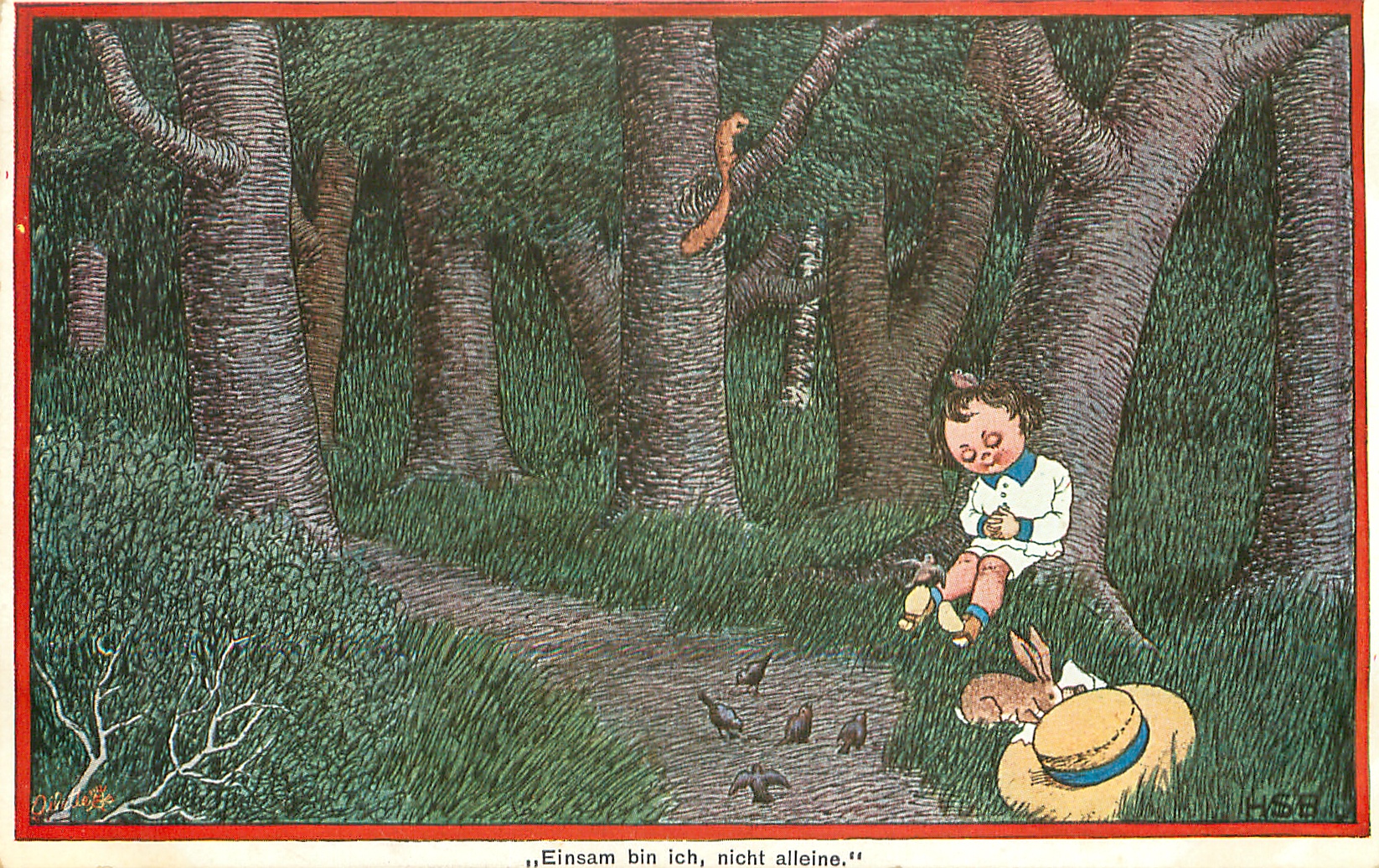"EINSAM BIN ICH, NICHT ALLEINE" young girl sits asleep at base of tree, rabbit & birds around, all dwarfed by dense forest, very large trees