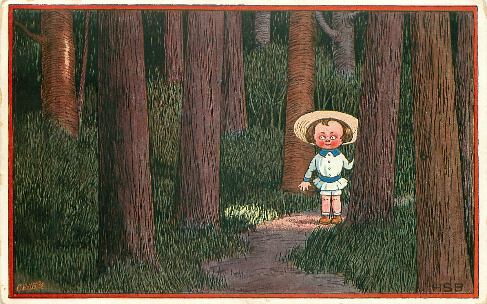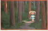 "HOFFEN UND HARREN" young girl stands on path, touching tree, looking front & scared, dwarfed by dense forest, very large trees