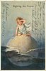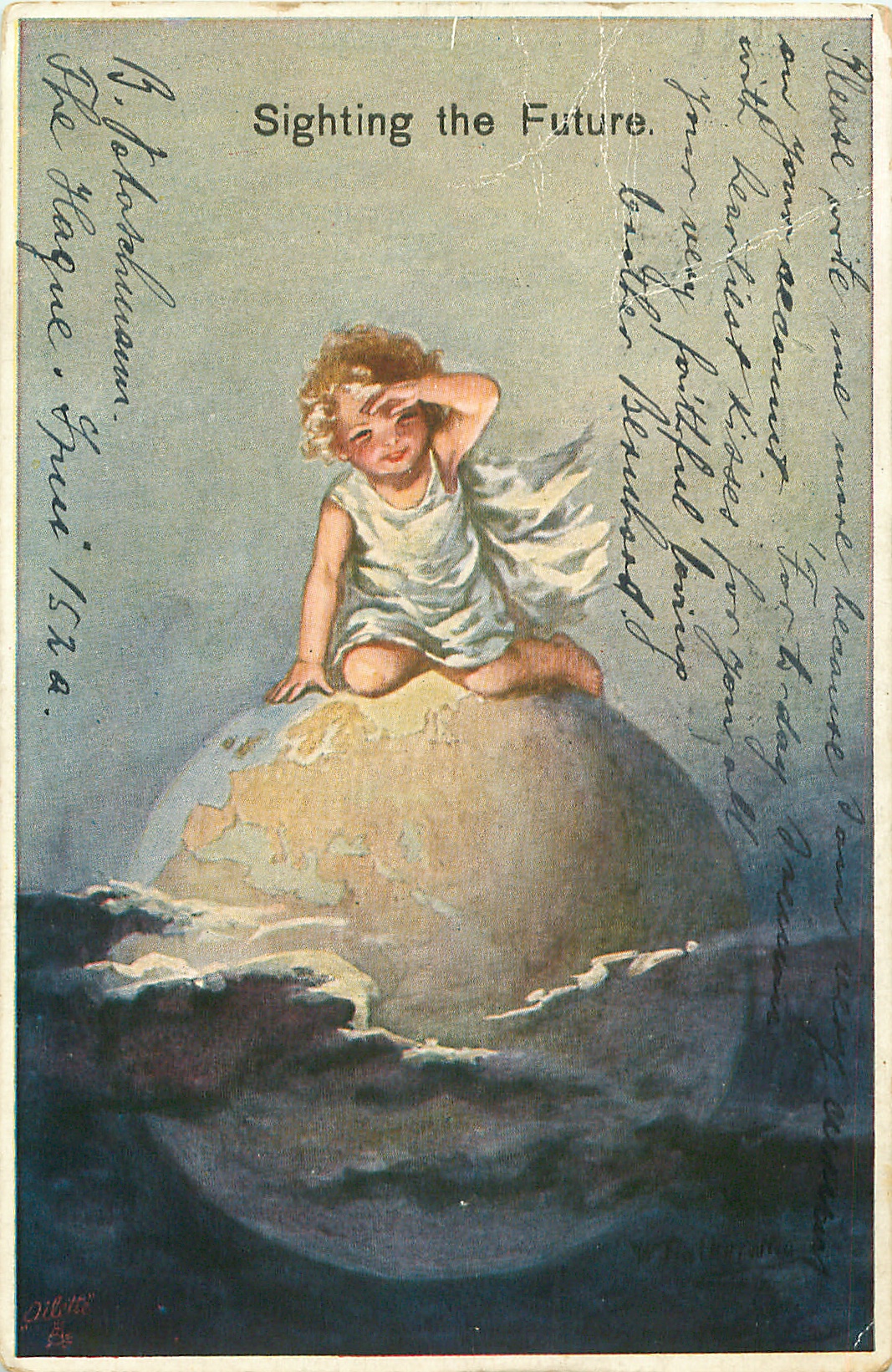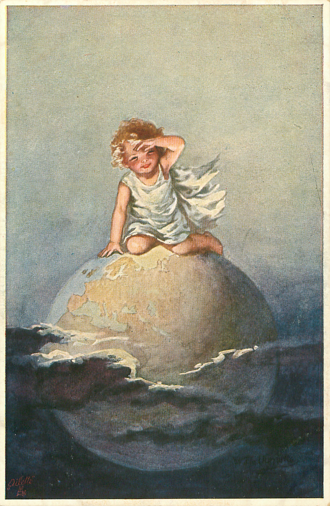 SIGHTING THE FUTURE, child sits on top of the globe peering into the distance