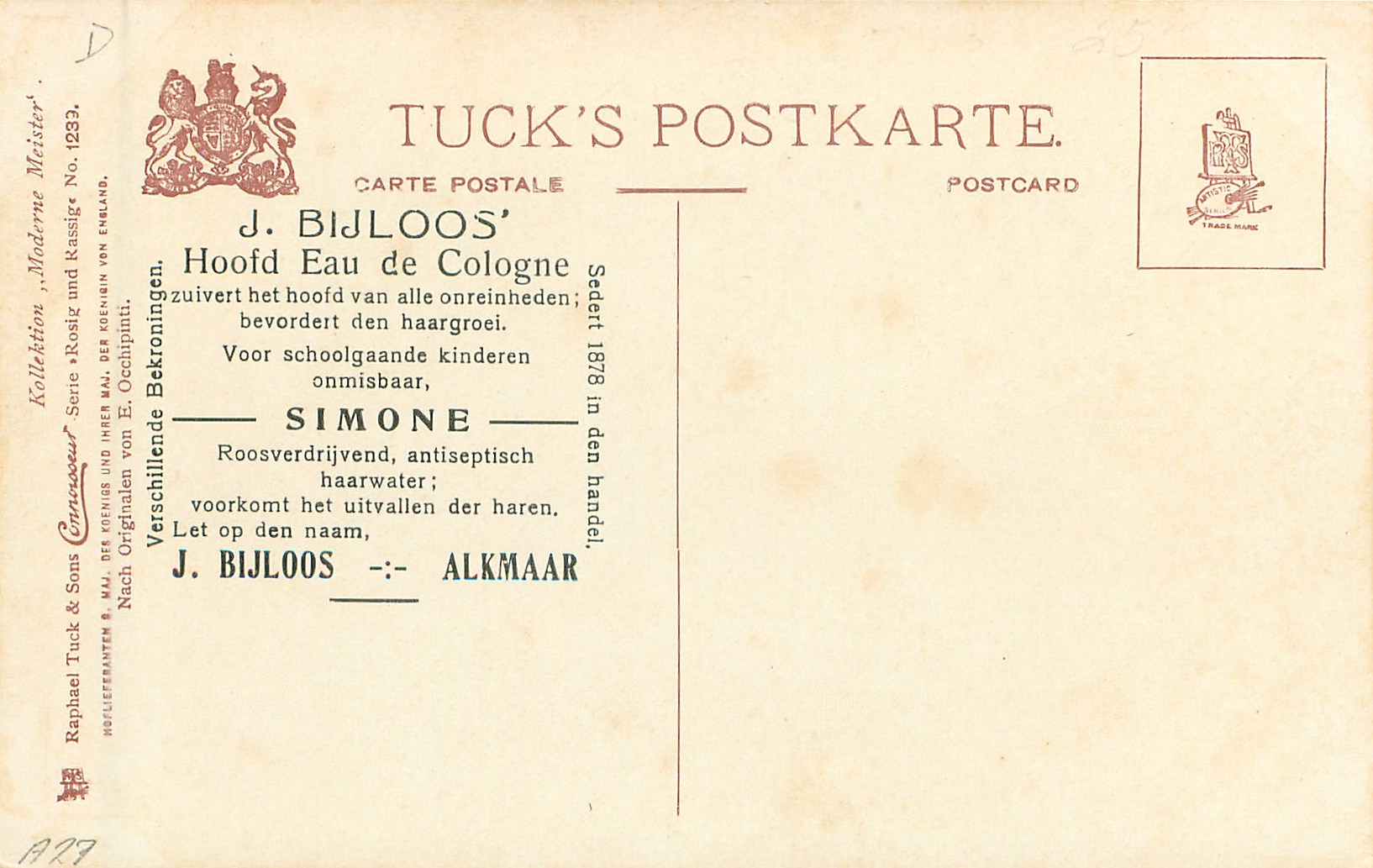 CONNOISSEUR with OILETTE (on front), NACH ORIGINALEN VON E. OCCHIPINTI., come with J. BIJLOOS' HOOFD EAU DE COLOGNE//ALKMAAR ad on back