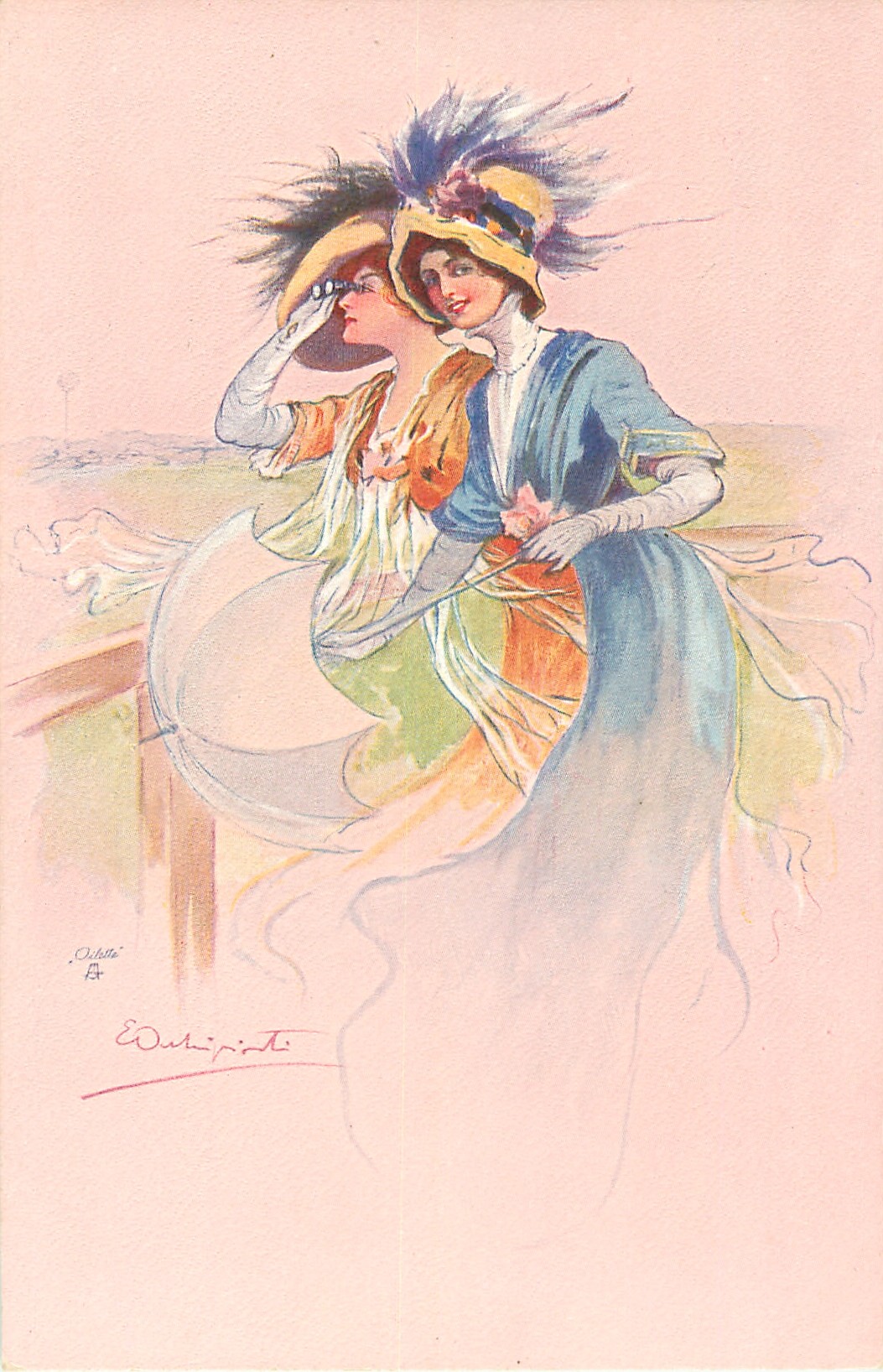 two pretty women stand on a windy day, one in front carries open umbrella,, facing left, pink background
