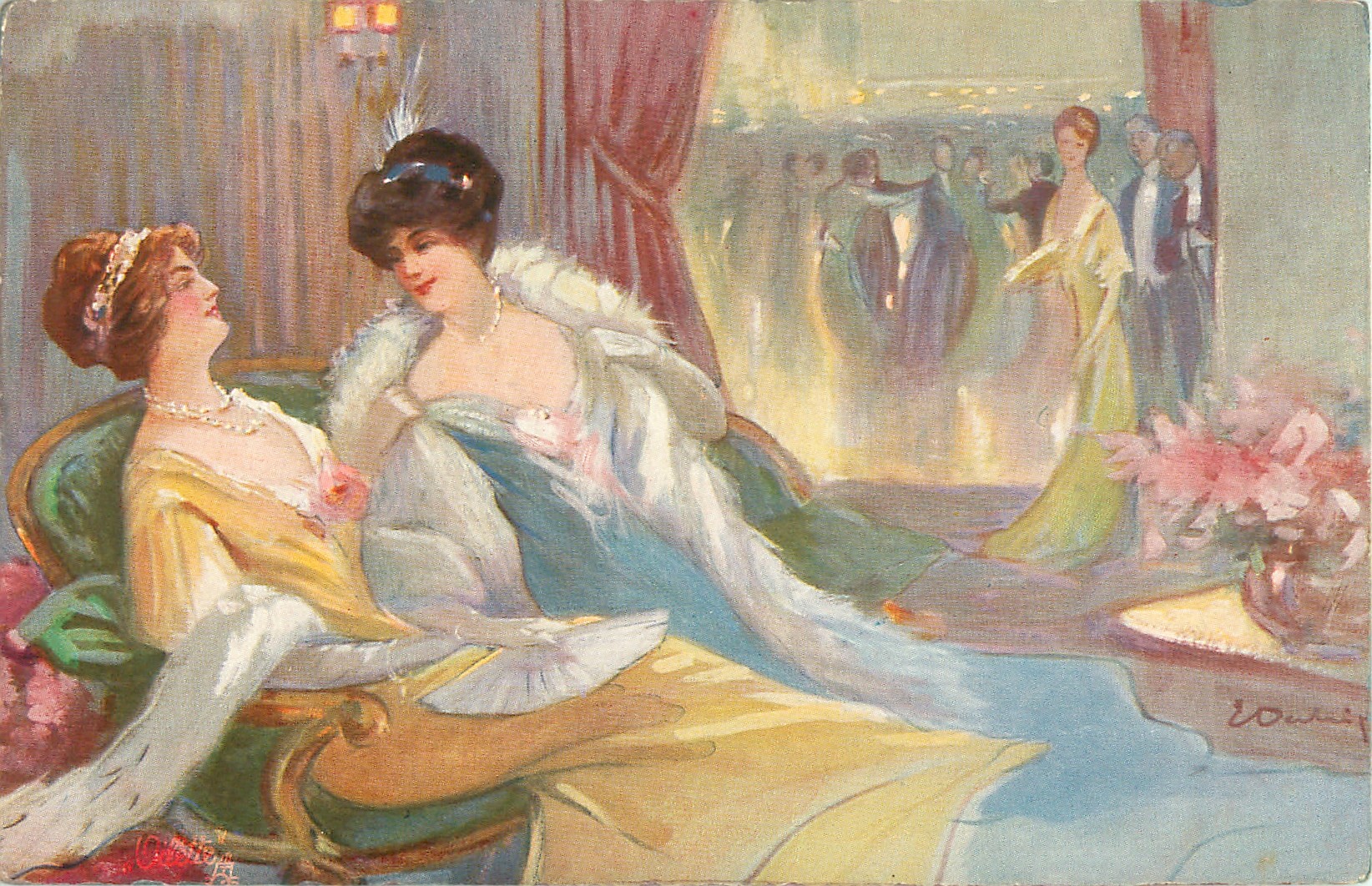 two elegantly dressed ladies sit talking on green sofa, distant crowd seen through curtained doorway