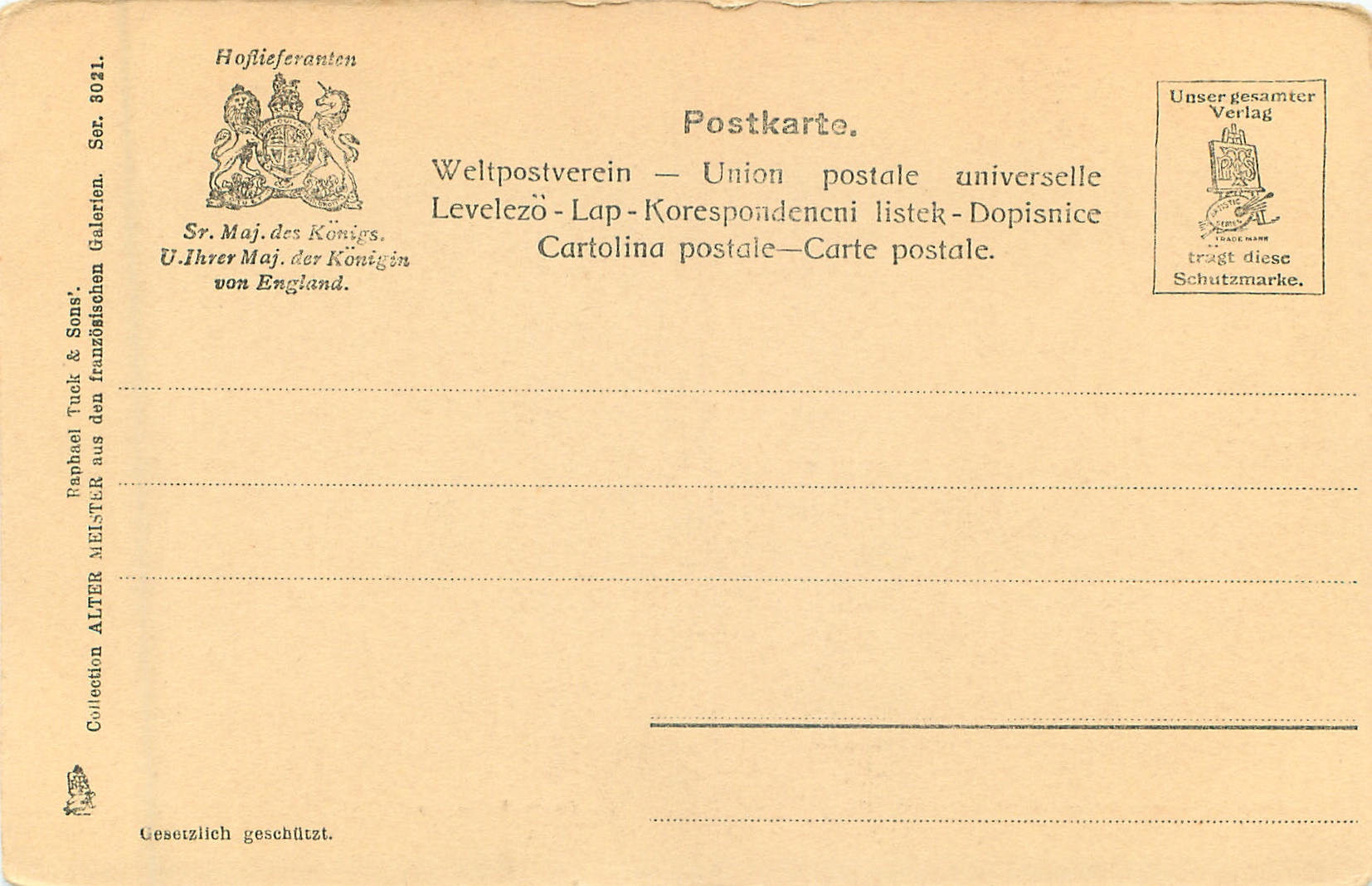 u/b, brown/purple, German/International backs, GESETZLICH GESCHUTZT, same images & numbers, French backs 3021 CHEFS D'OEUVRE DU MUSEE DU LOUVRE