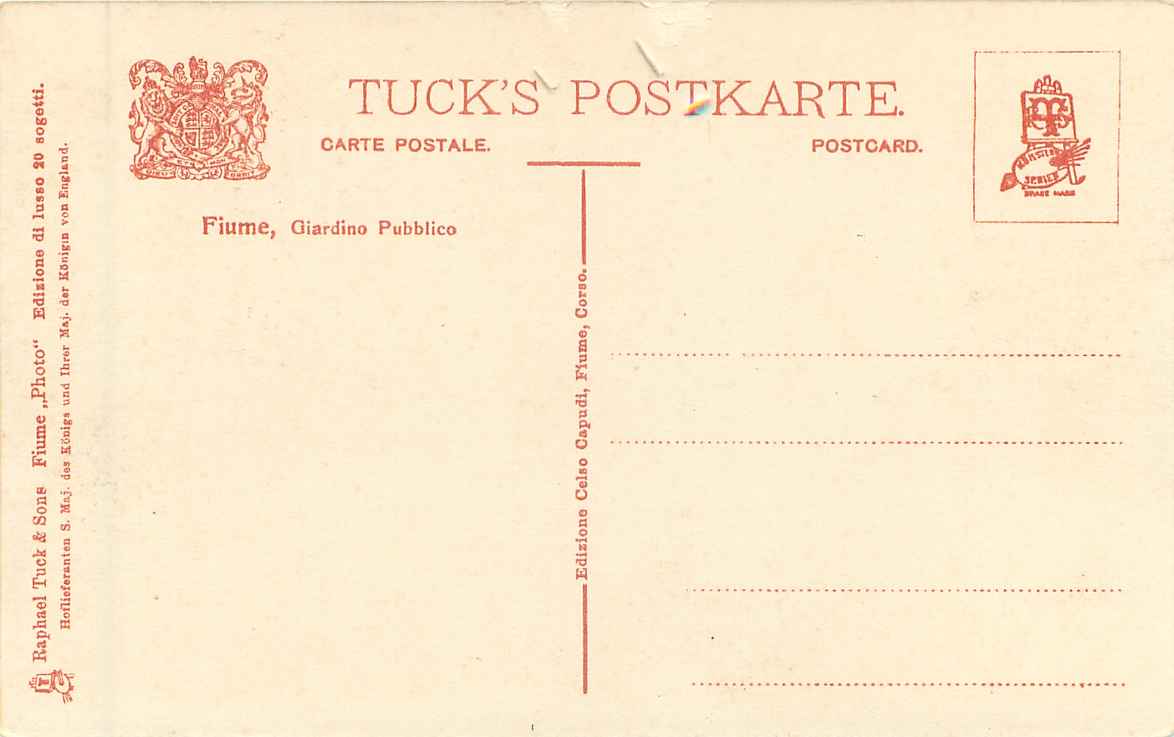 sepia on yellow background, FIUME PHOTO EDIZIONE DI LUSSO 20 SOGETTI, EDIZIONE CELSO CAPUDI, FIUME, CORSO (vert. mid-card), back partly in German