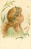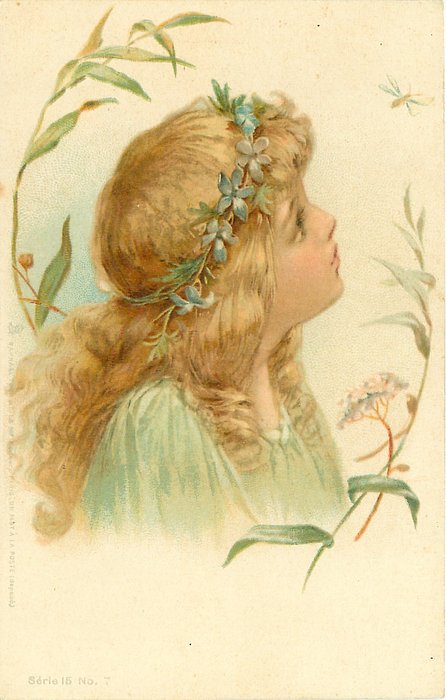 head & shoulders study of girl in green faces right looking up at insect