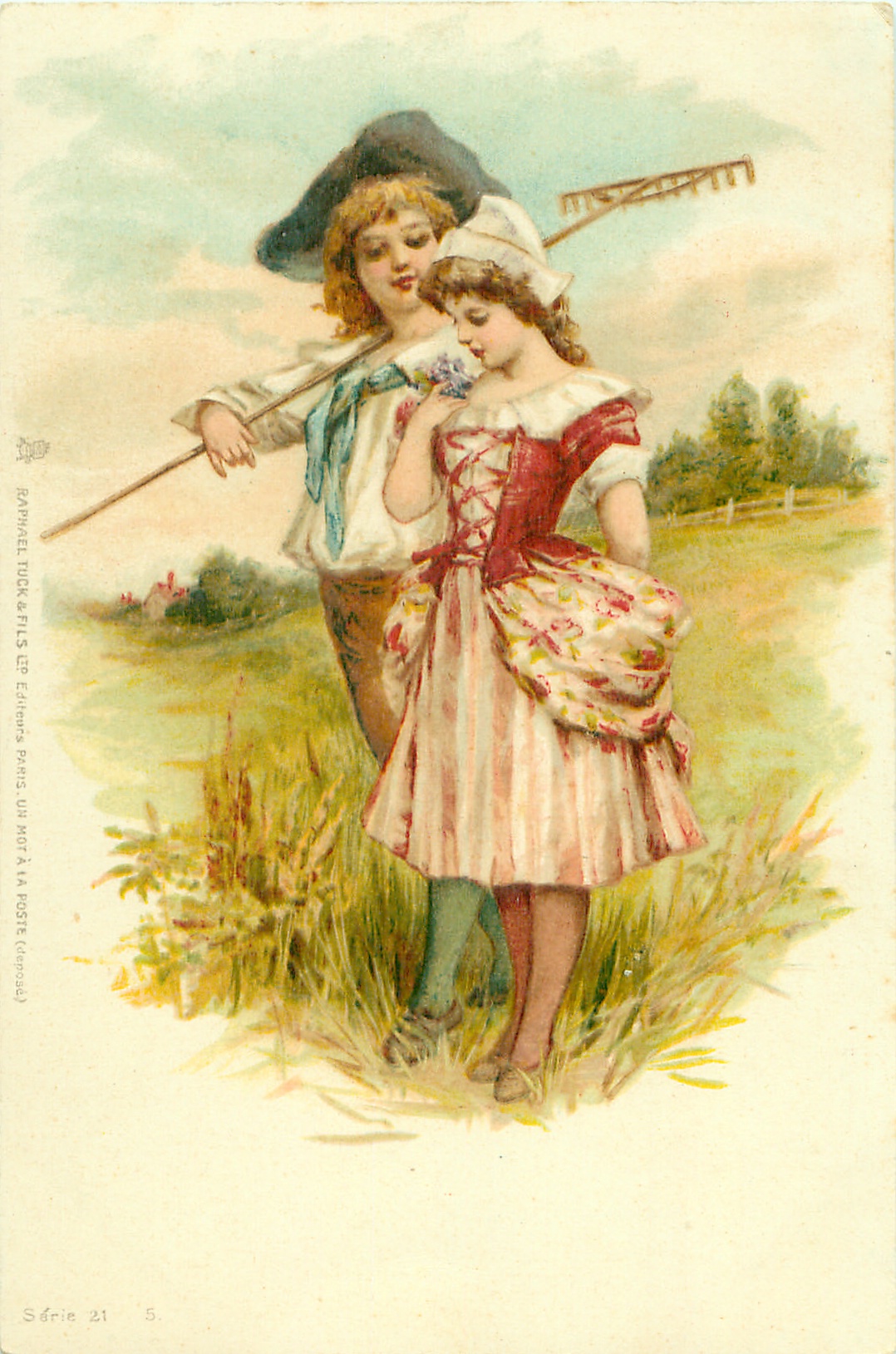 boy left & behind girl, he carries rake on his shoulder