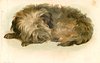 fluffy dark terrier puppy curled up asleep with paws to left