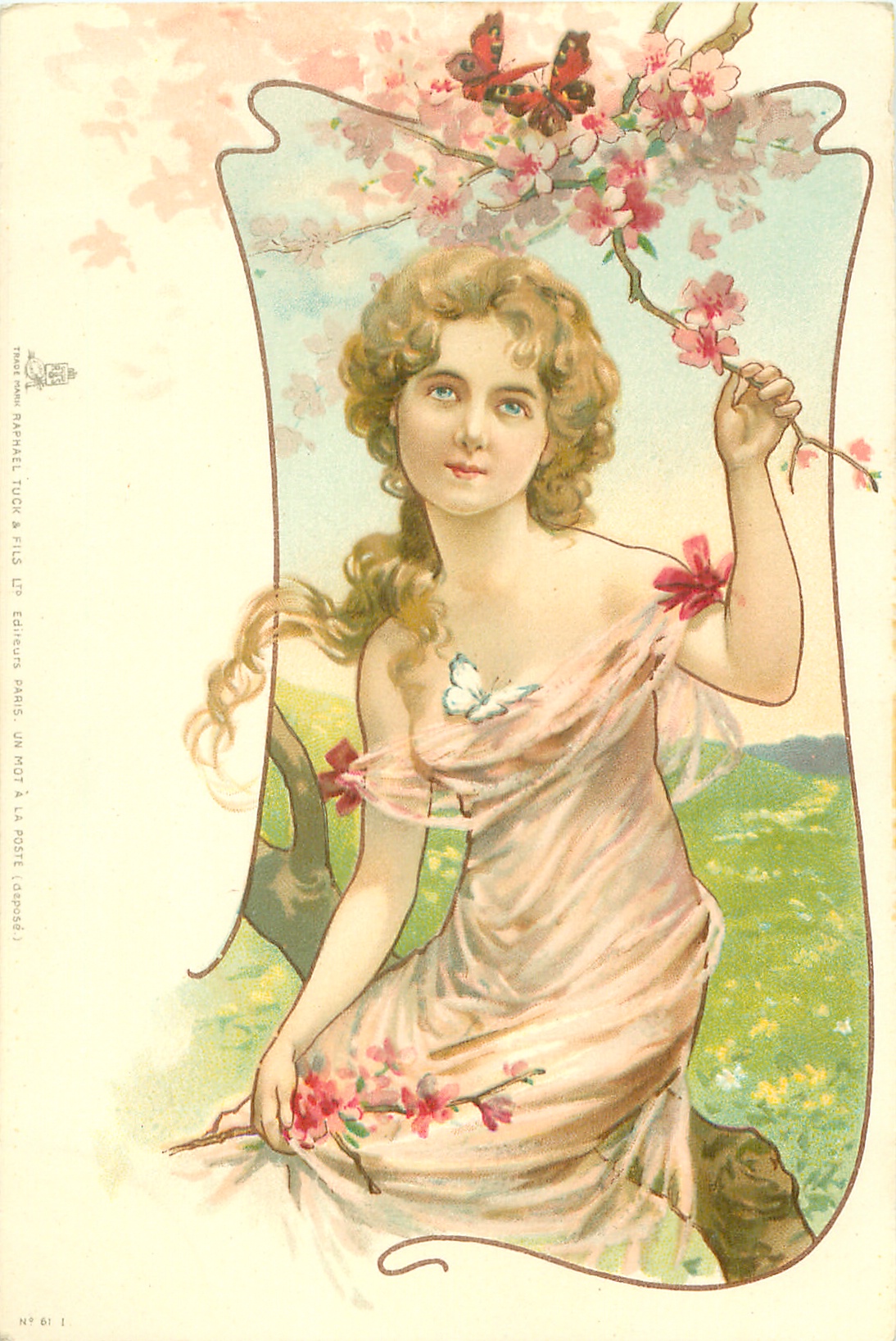 girl in filmy pink dress sits on branch looking up at 2 butterflies on pink blossom