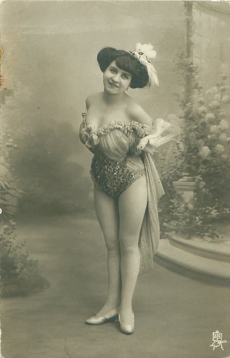pretty brunette in very off shoulder costume, filmy cape & bird head-dress, faces front/left both hands behind her back
