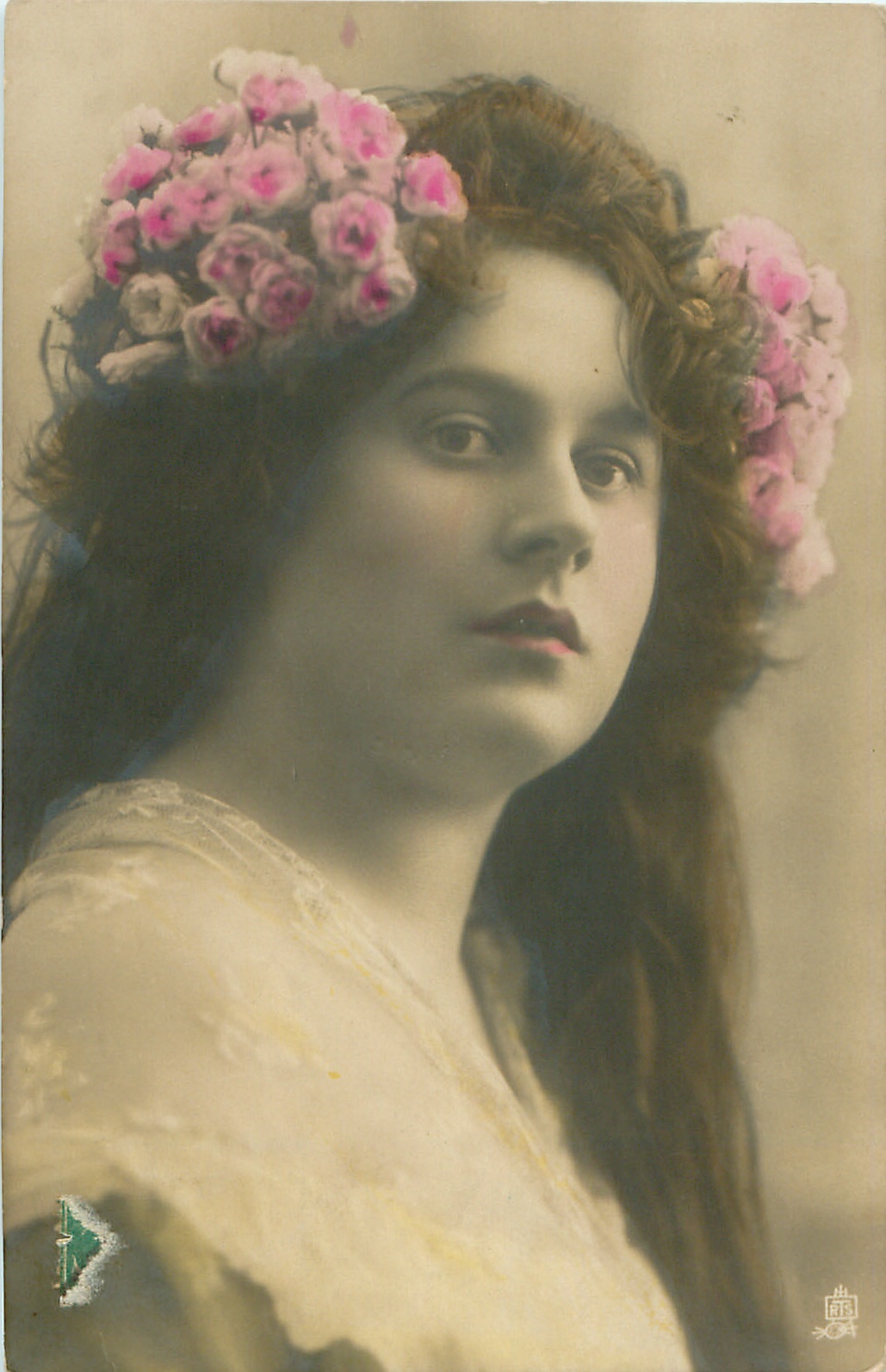 editions artistique, head & shoulder studies of pretty long-haired brunette with roses in her hair