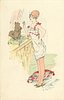 girl in underwear faces left offering treat to begging small fluffy dog on shelf