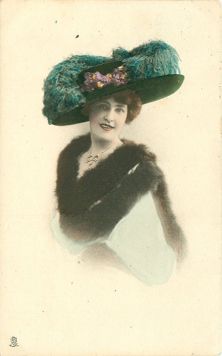 almost half-length study of dark haired girl with large blue ostrich feather hat, fur drape, facing partly left, looking front