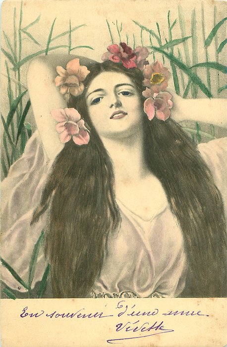 head & shoulder study of girl with flowers in her very long hair, both hands behind her head