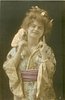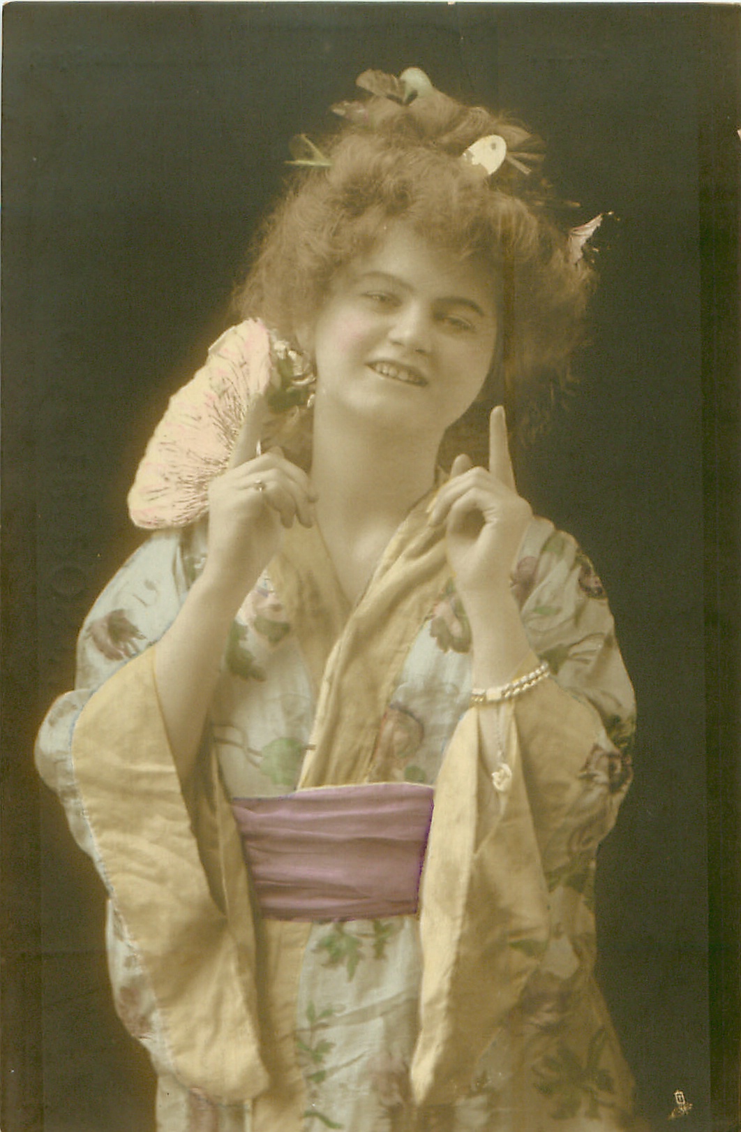 three quarter length study of girl dressed in kimono, both hands index fingers point up, faces & looks front
