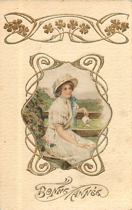 elaborate nouveau gilt decoration around silk inset, pretty girl sitting on style, facing parly right, looking up