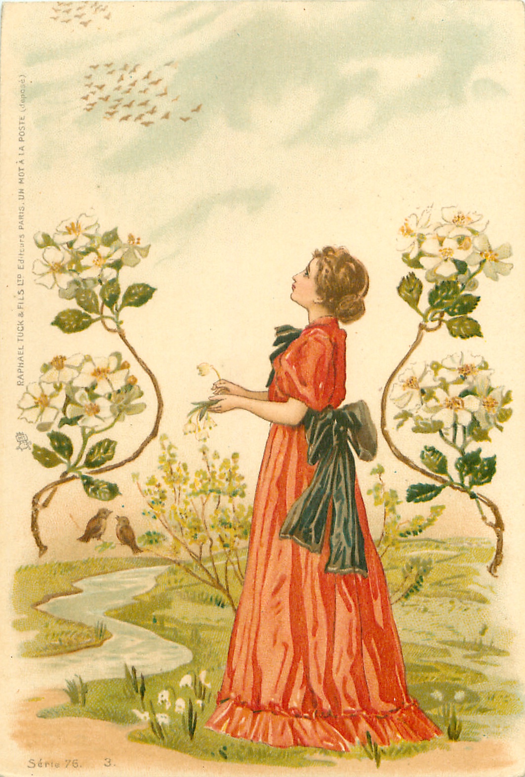 woman in red dress looks up at flock of flying birds, floral surround & background