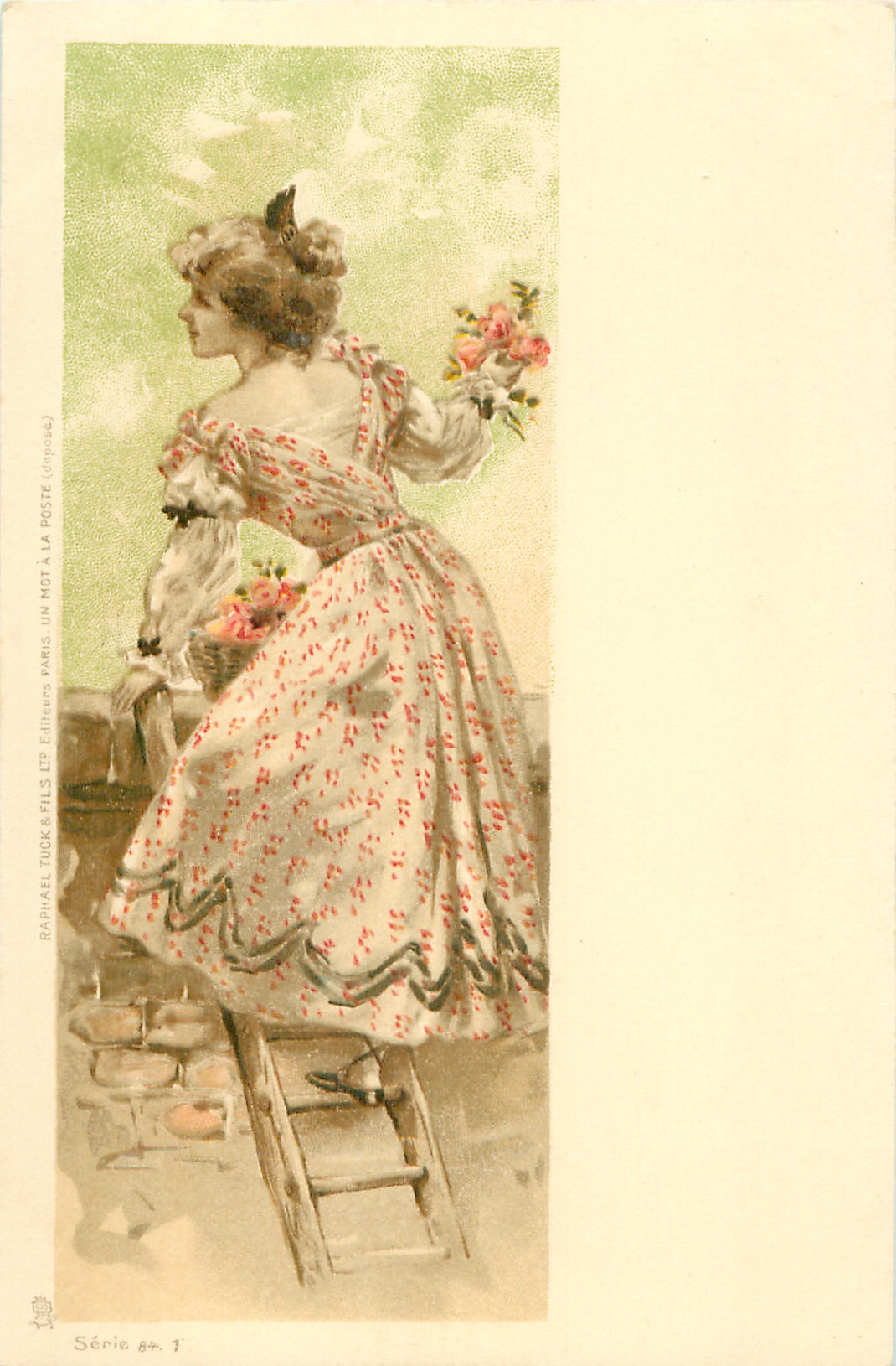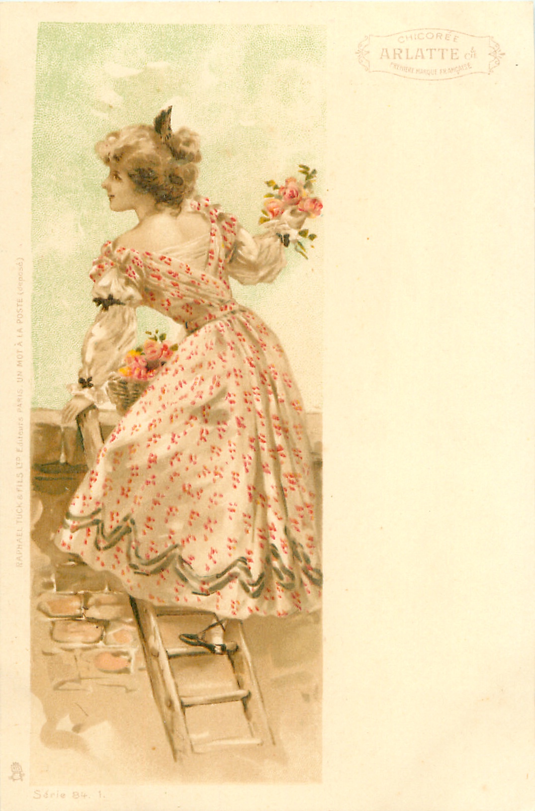 woman in white and pink patterned dress, standing on ladder holding a bunch of roses