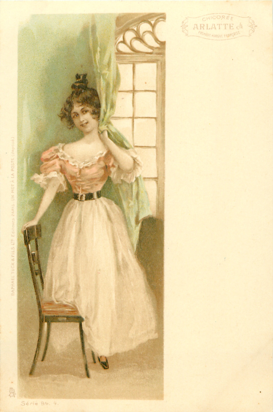 u/b, UN MOT A LA POSTE, (DEPOSE), same image English back 1571-1574, come with advert. on front in black CHICOREE ARLATTE & CIE PREMIER MARQUE FRANCAIS