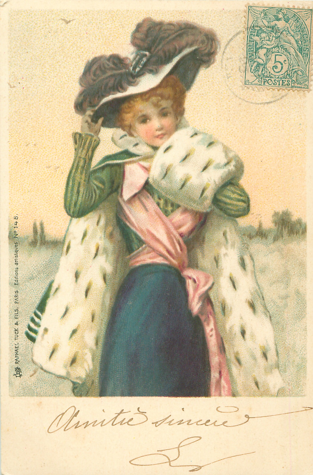 woman in deep green skirt & ornate hat stands in fur lined cape & muff, one hand touches muff
