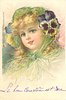 head & shoulder study of young girl in green, pansies dress her hat