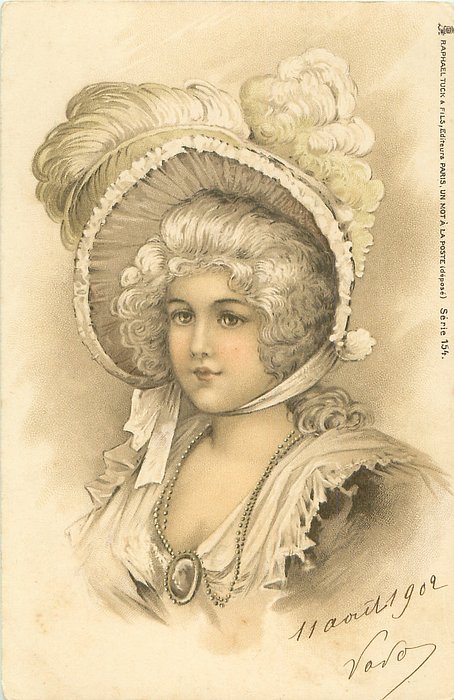 left woman in hat trimmed with ostrich feathers faces & looks partly left