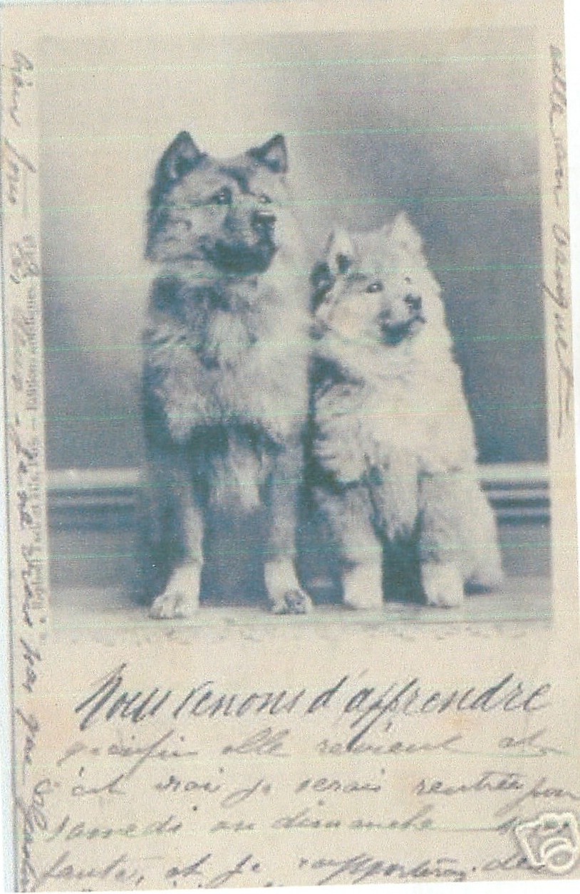 two chows sit looking up & right