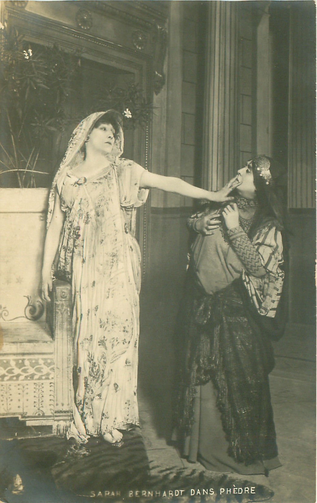 Bernhardt stands left, arm outstretched to face of older woman,right rejecting her