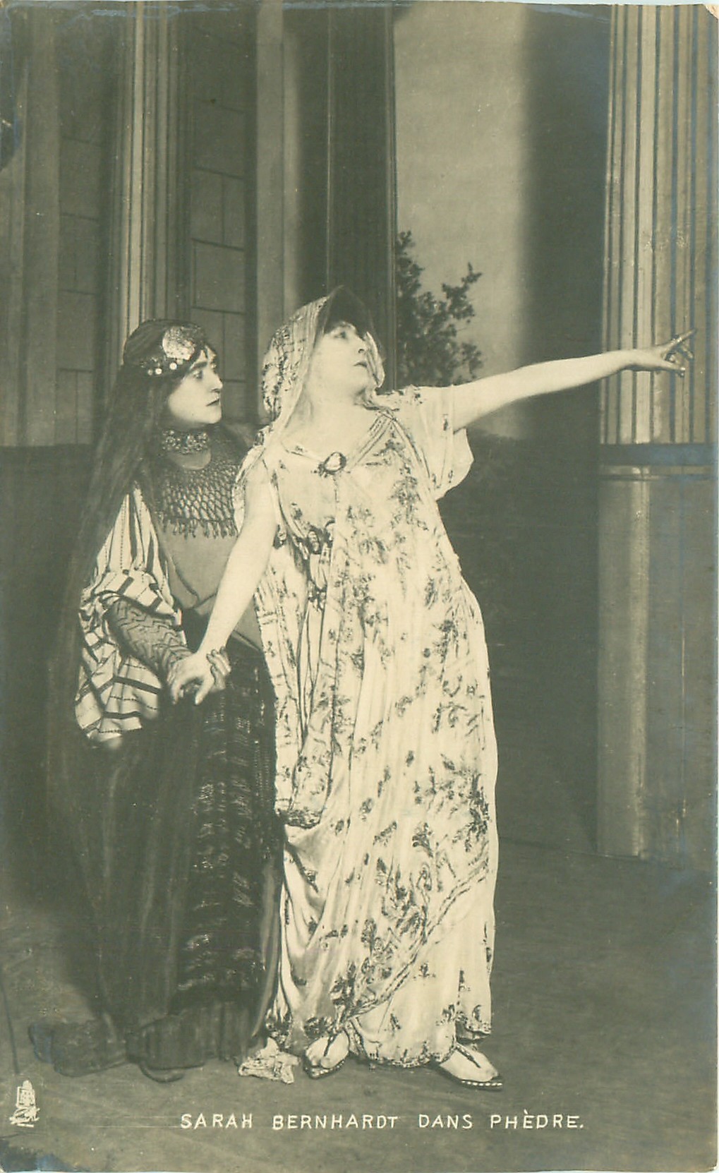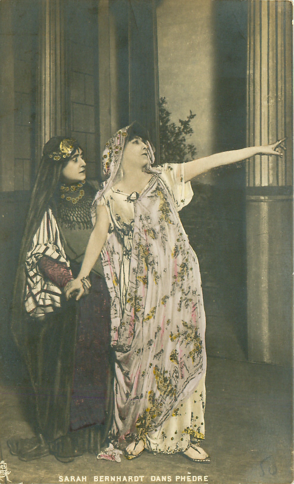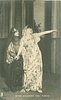 Bernhardt stands right, arm outstretched to right, woman behind left