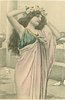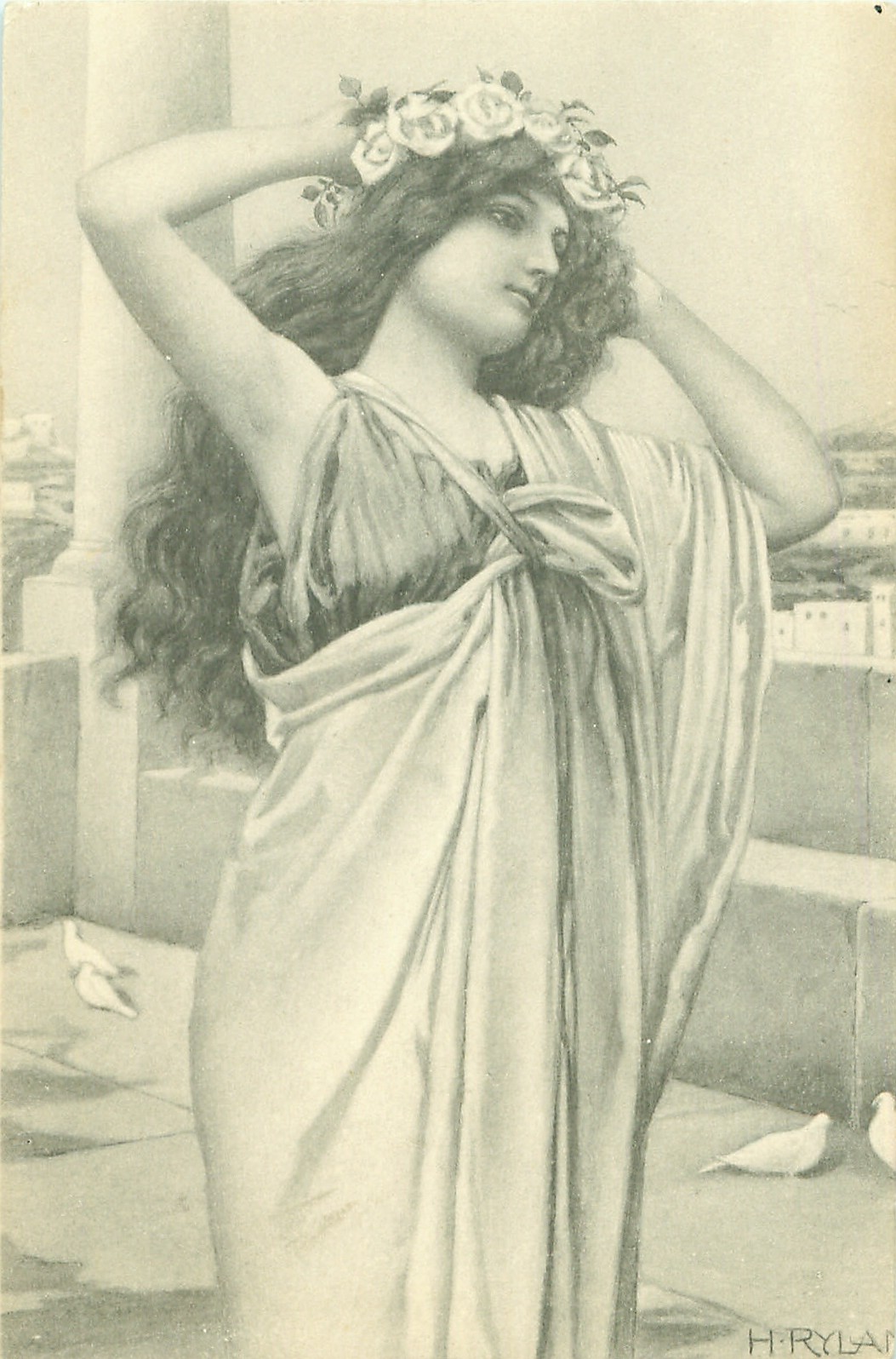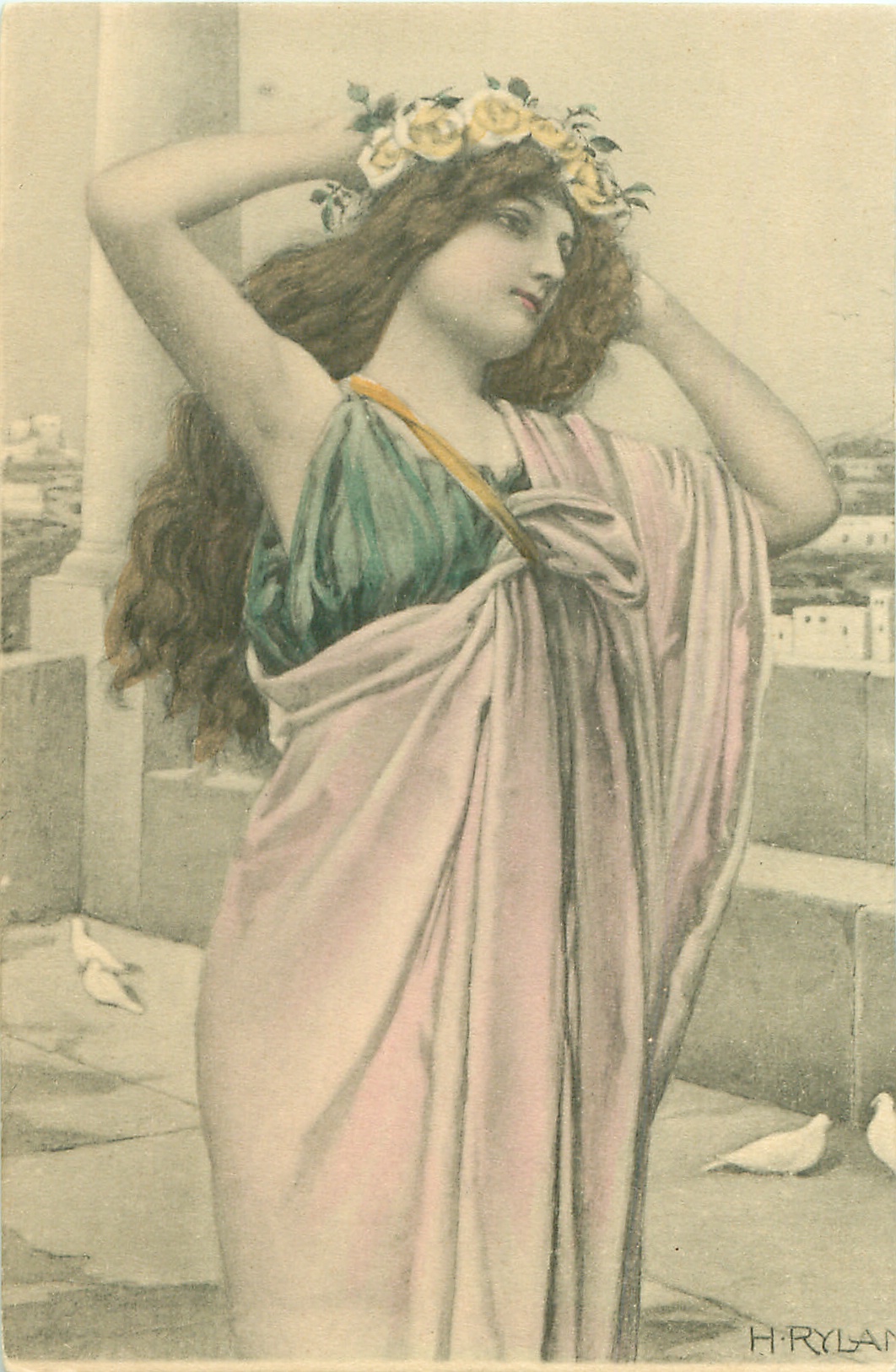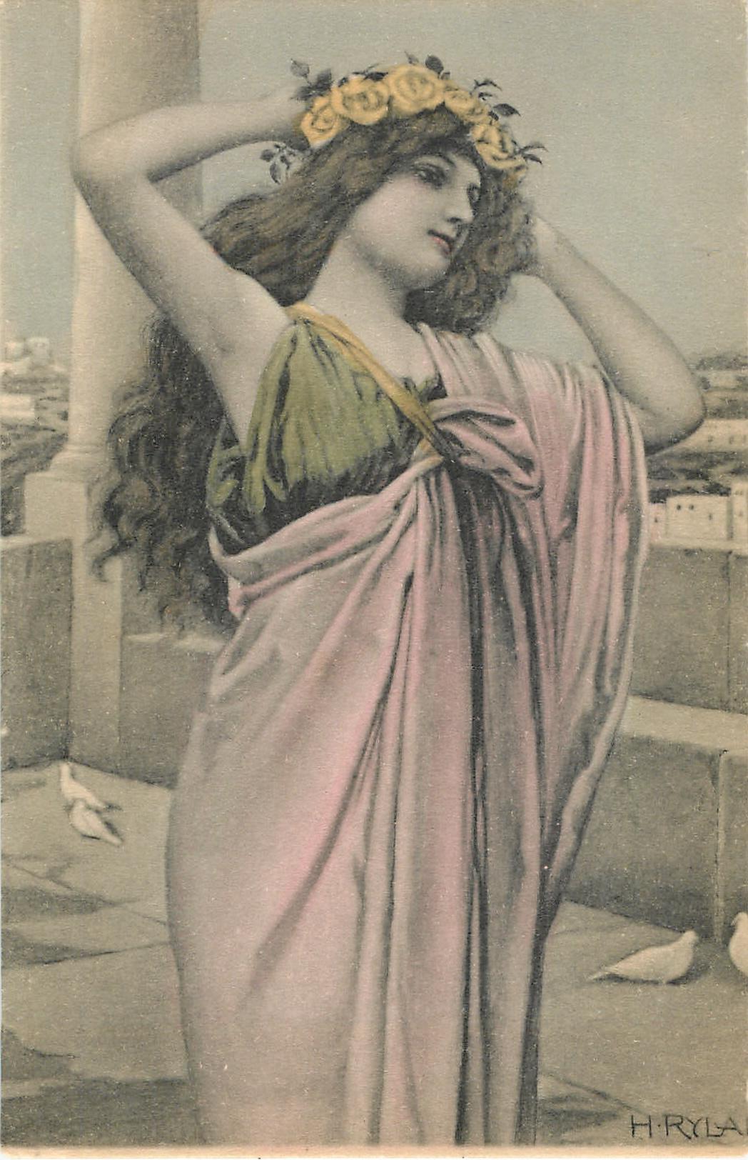long haired woman stands on stone balcony with hands behind her head, 4 pigeons below
