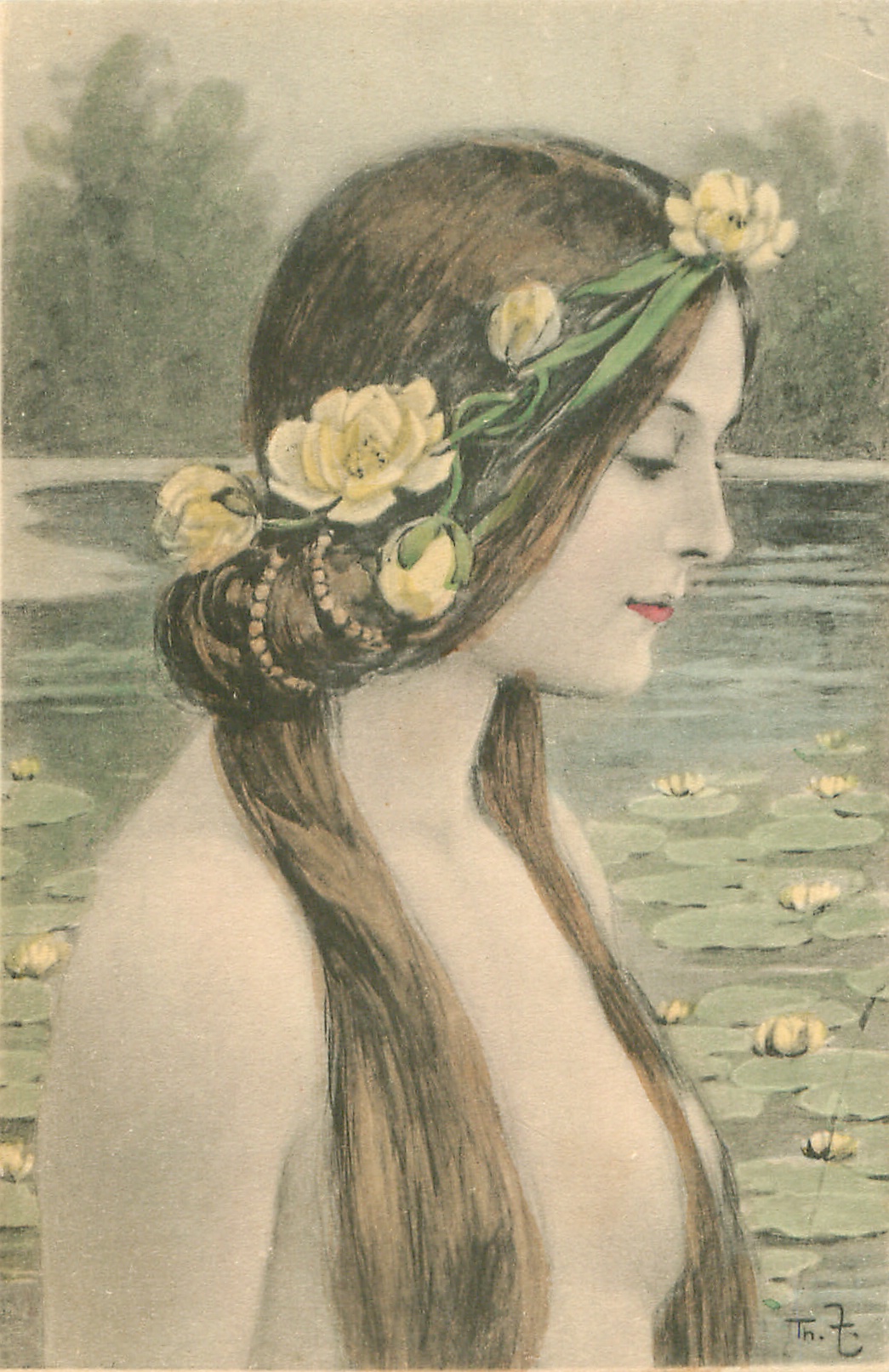 head & shoulders of woman with water lilies in her hair, facing & looking right, pond with lilies behind