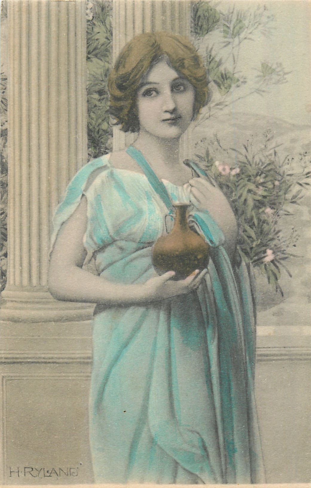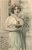 short haired brunette stands on stone balcony holding vase & flowers, facing partly right, looking front, 2 columns behind