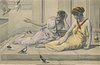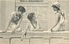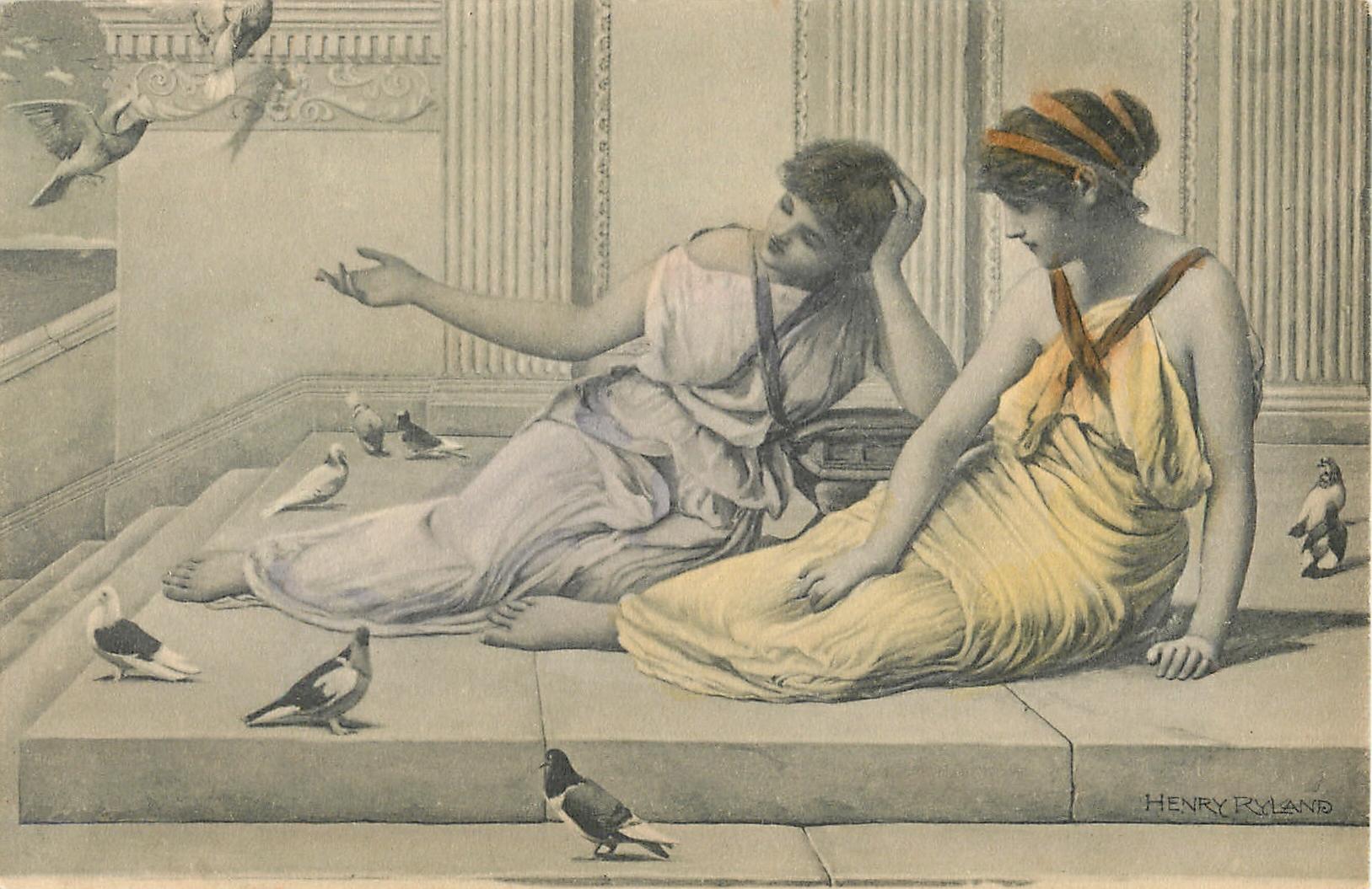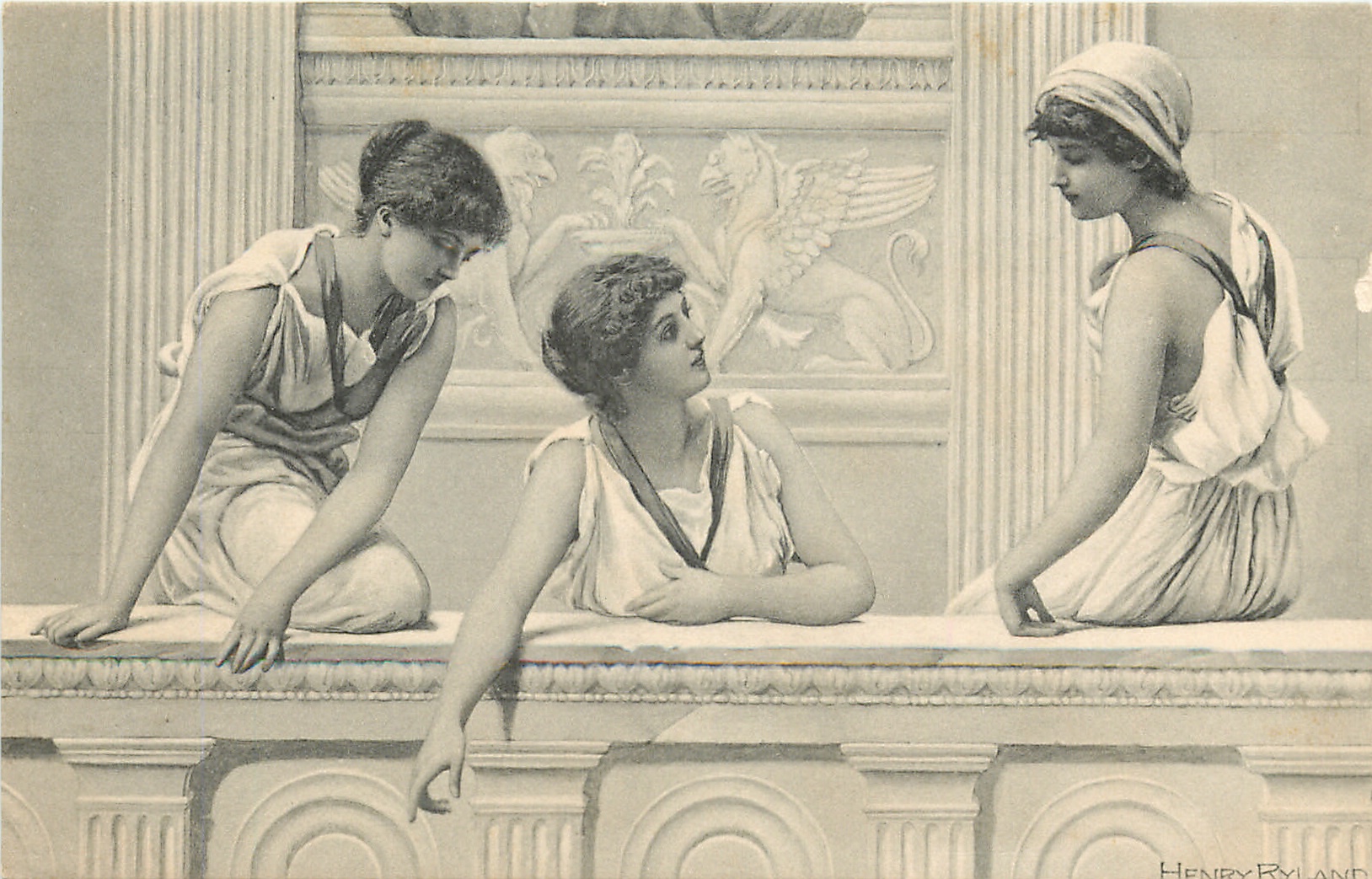 three girls on balcony, centre girl looks right whilst pointing down