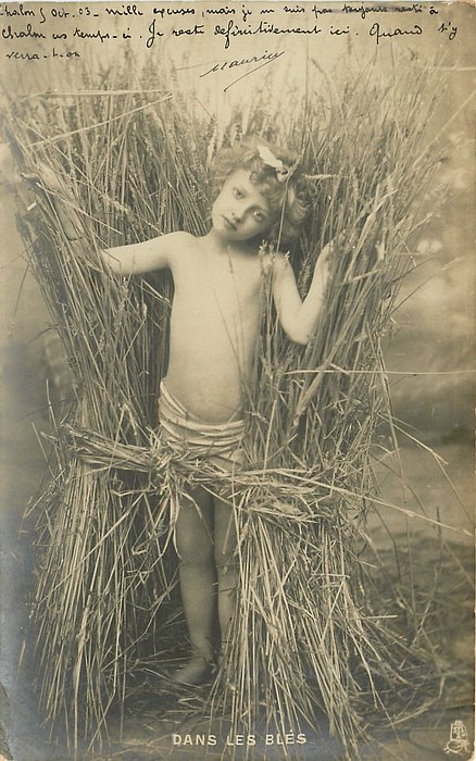 DANS LES BLES young girl dressed only in loincloth, stands in sheaf of wheat, both legs mostly visible