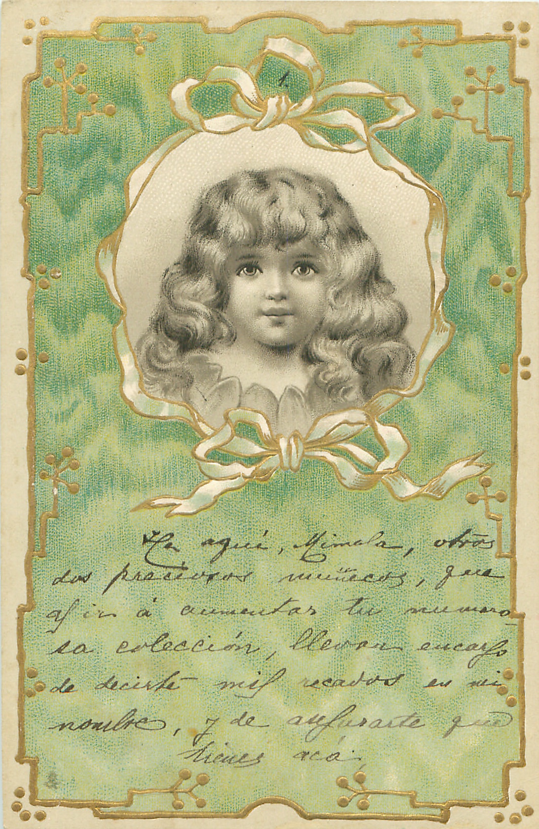inset of girls head, she looks front, set in ornate ribbon surround, olive green background