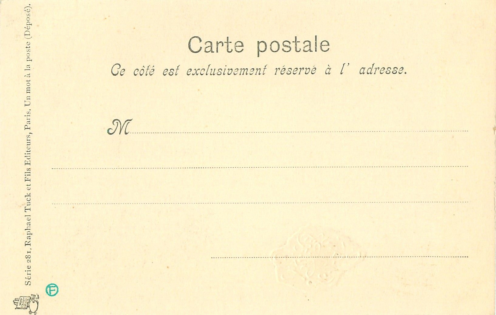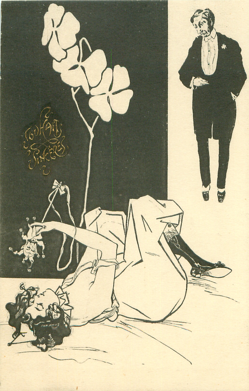 u/b, black & white, come hand-coloured, UN MOT A LA POSTE, (DEPOSE), come gilt embossed SOUHATS SINCERES or 1 ER APRIL, come opt. in red on back LA PLUS IMPORTANTE SPECIALITE DE PAPIER A LETTRES COQUEMER, GRAVEUR, IMPRIMATEUR, 10, RUE BAYEN, PARIS, come opt. in purple on front BAL TABARIN