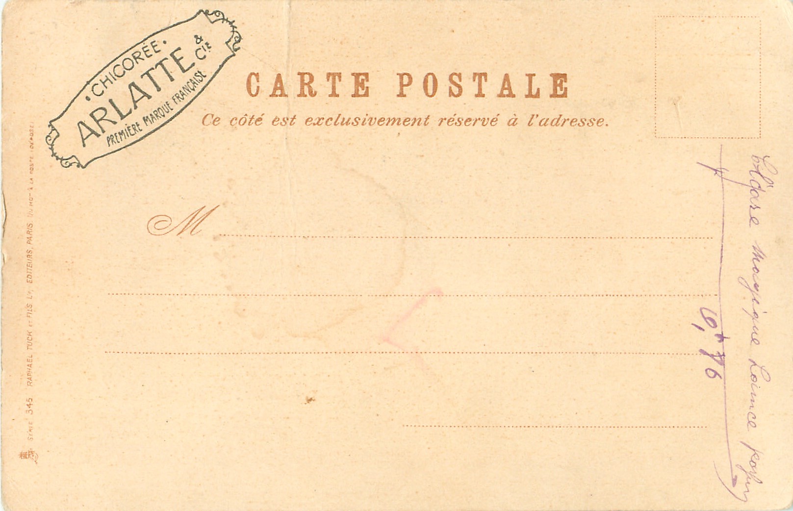 u/b, UN MOT A LA POSTE (DEPOSE), varying styles same basic images of young women each representing a flower, same large images ELITE 3013 & PROOF EDITION 7 (advertised.1902/1903) & as insets CHRISTMAS 1907 & 1920, CONNOISSEUR 2586, also French back SERIE 344, come with grey advert. on back CHICOREE ARLATTE & CIE PREMIERE MARQUE FRANCAIS
