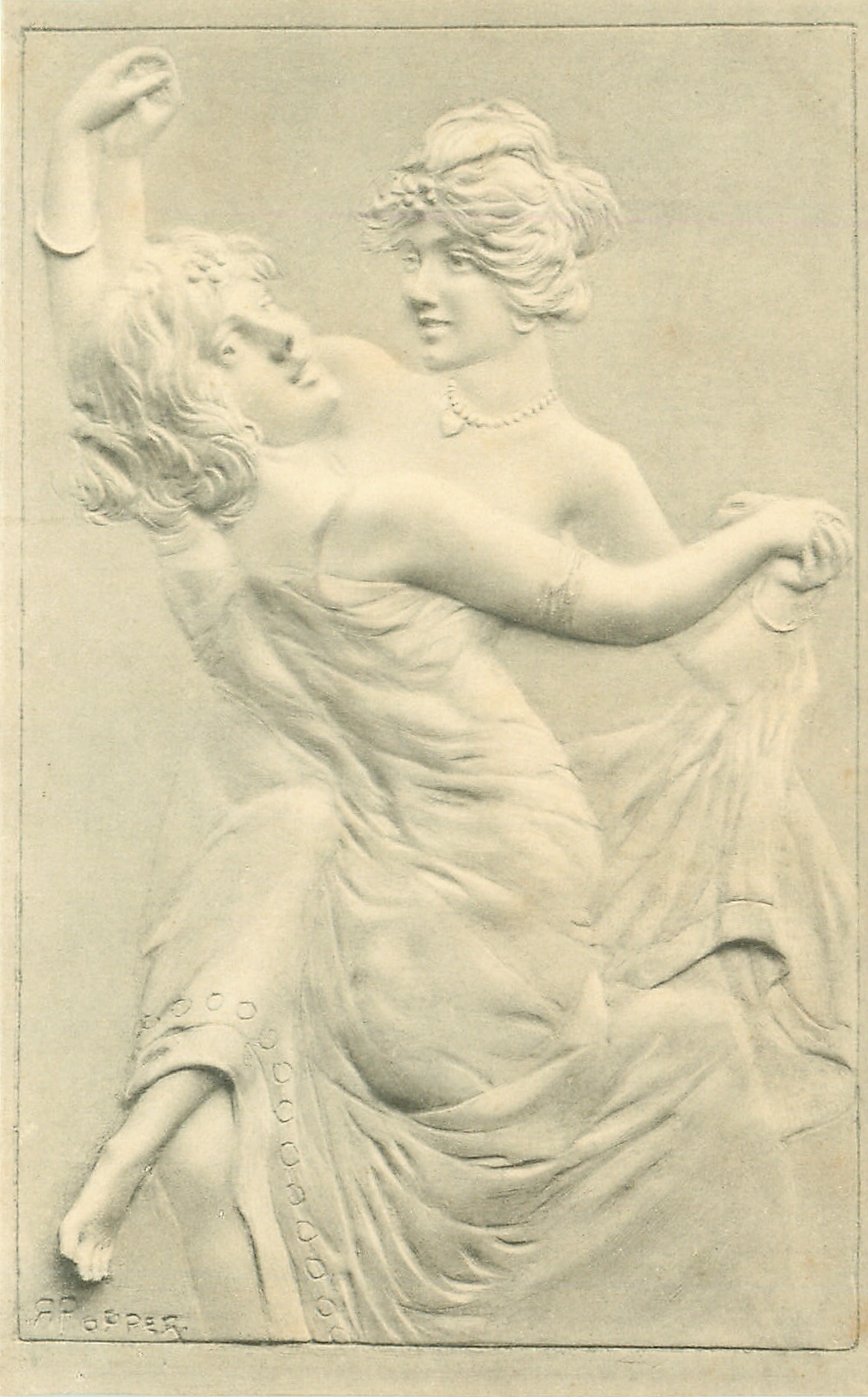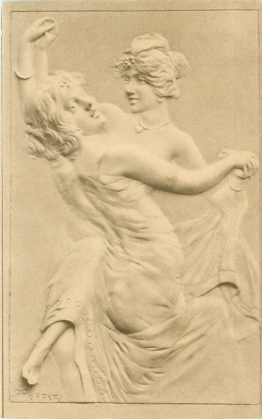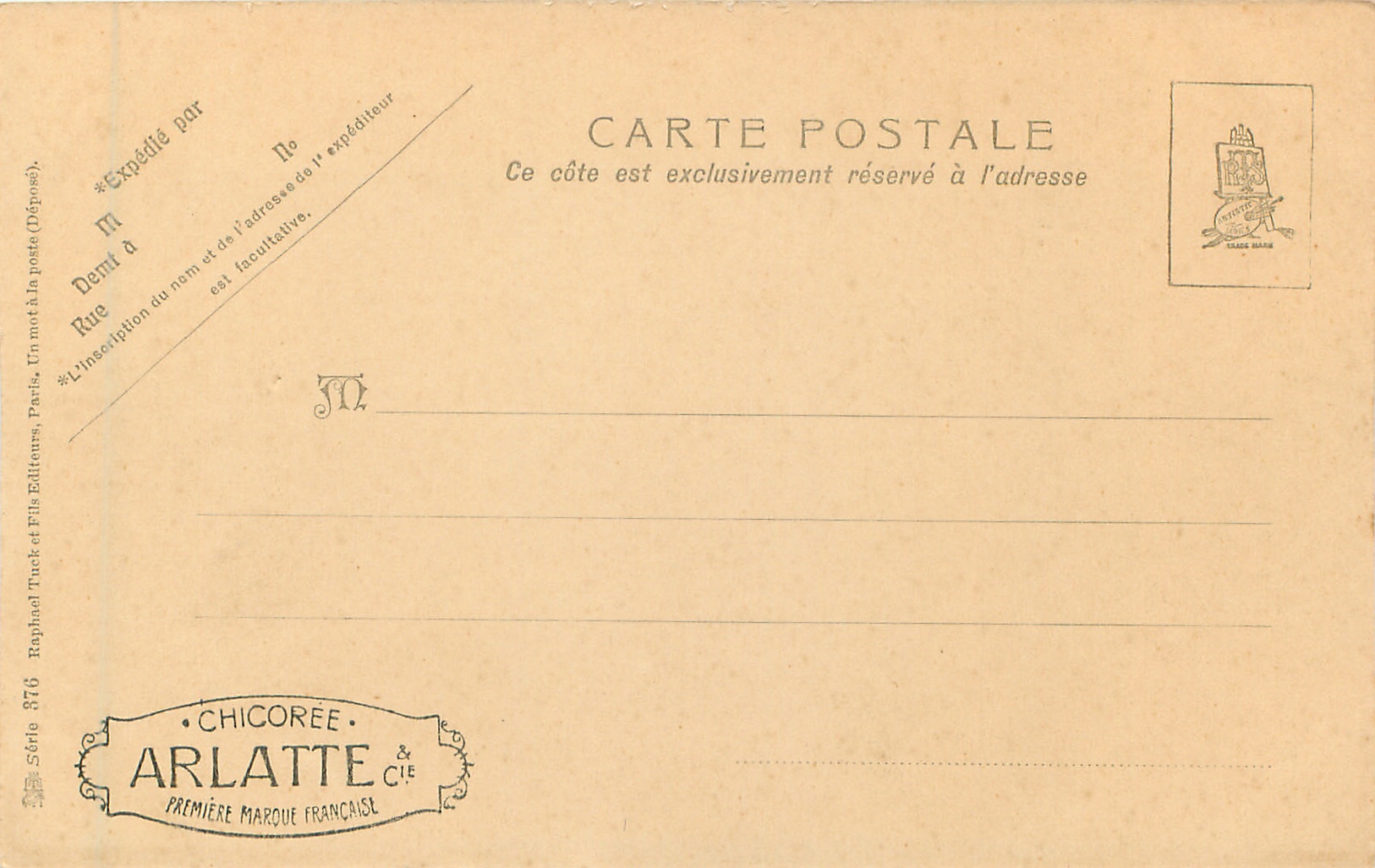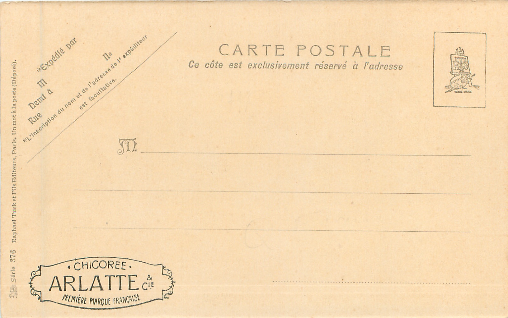 u/b, shades of grey or bistre, UN MOT A LA POSTE, (DEPOSE), pictures of sculptures to give 3-d effect, come with CHICOREE ARLATTE & CIE PREMIER MARQUE FRANCAIS advert. in grey on back