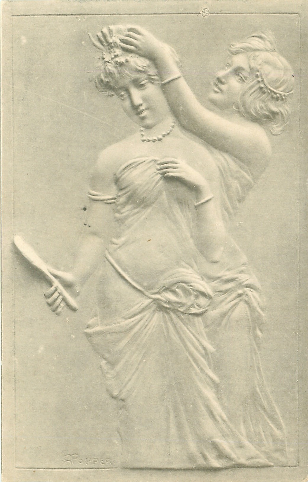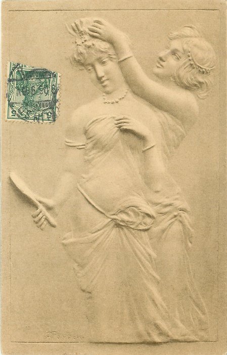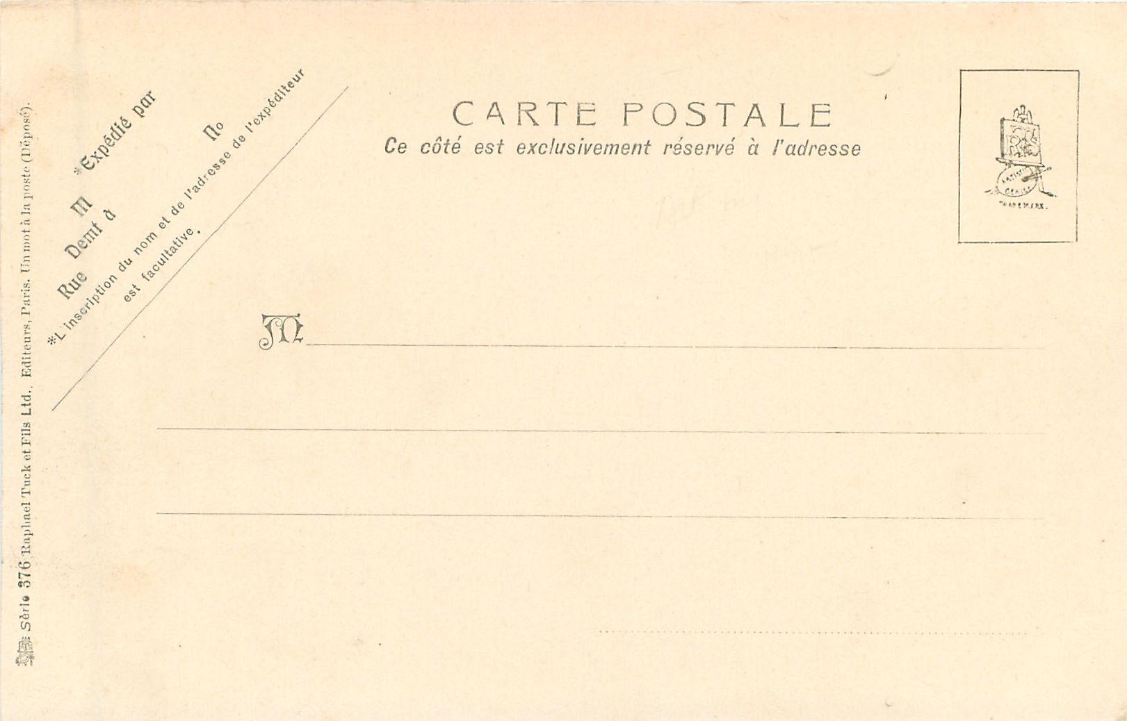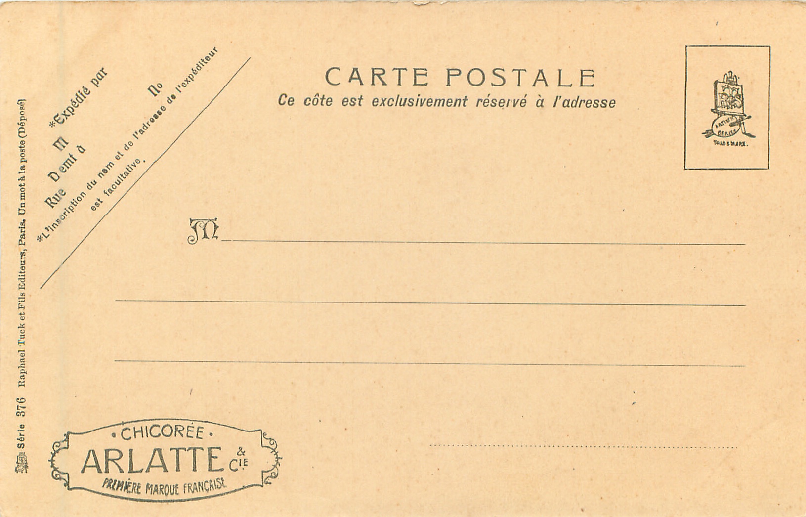 u/b, shades of grey or bistre, UN MOT A LA POSTE, (DEPOSE), pictures of sculptures to give 3-d effect, come with CHICOREE ARLATTE & CIE PREMIER MARQUE FRANCAIS advert. in grey on back