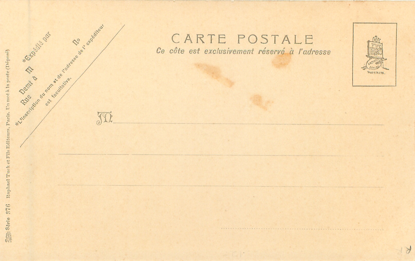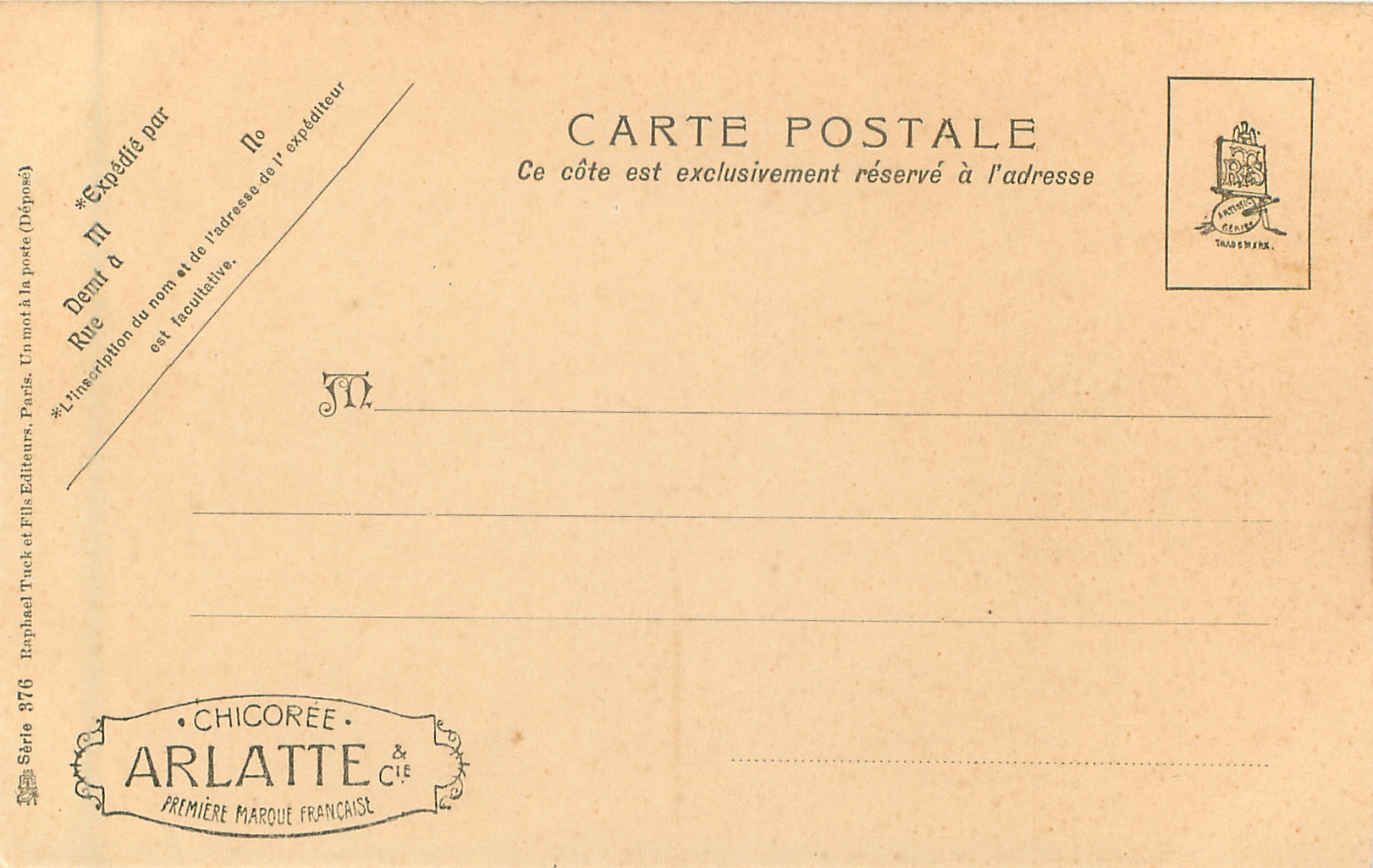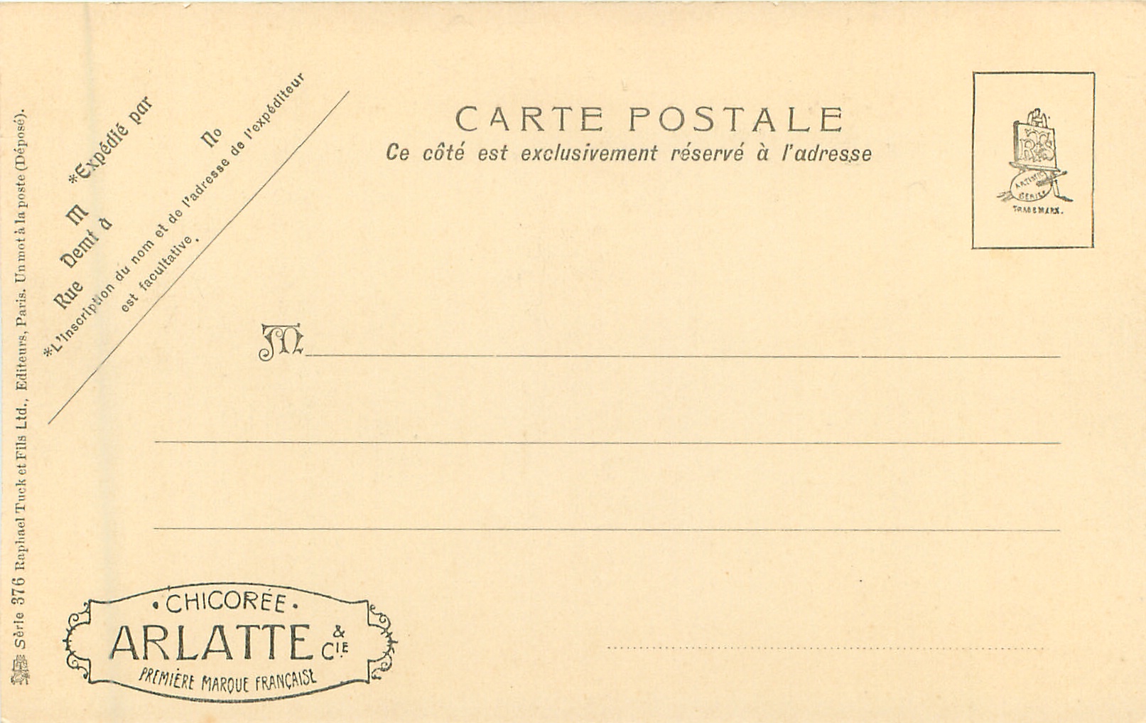 u/b, shades of grey or bistre, UN MOT A LA POSTE, (DEPOSE), pictures of sculptures to give 3-d effect, come with CHICOREE ARLATTE & CIE PREMIER MARQUE FRANCAIS advert. in grey on back