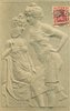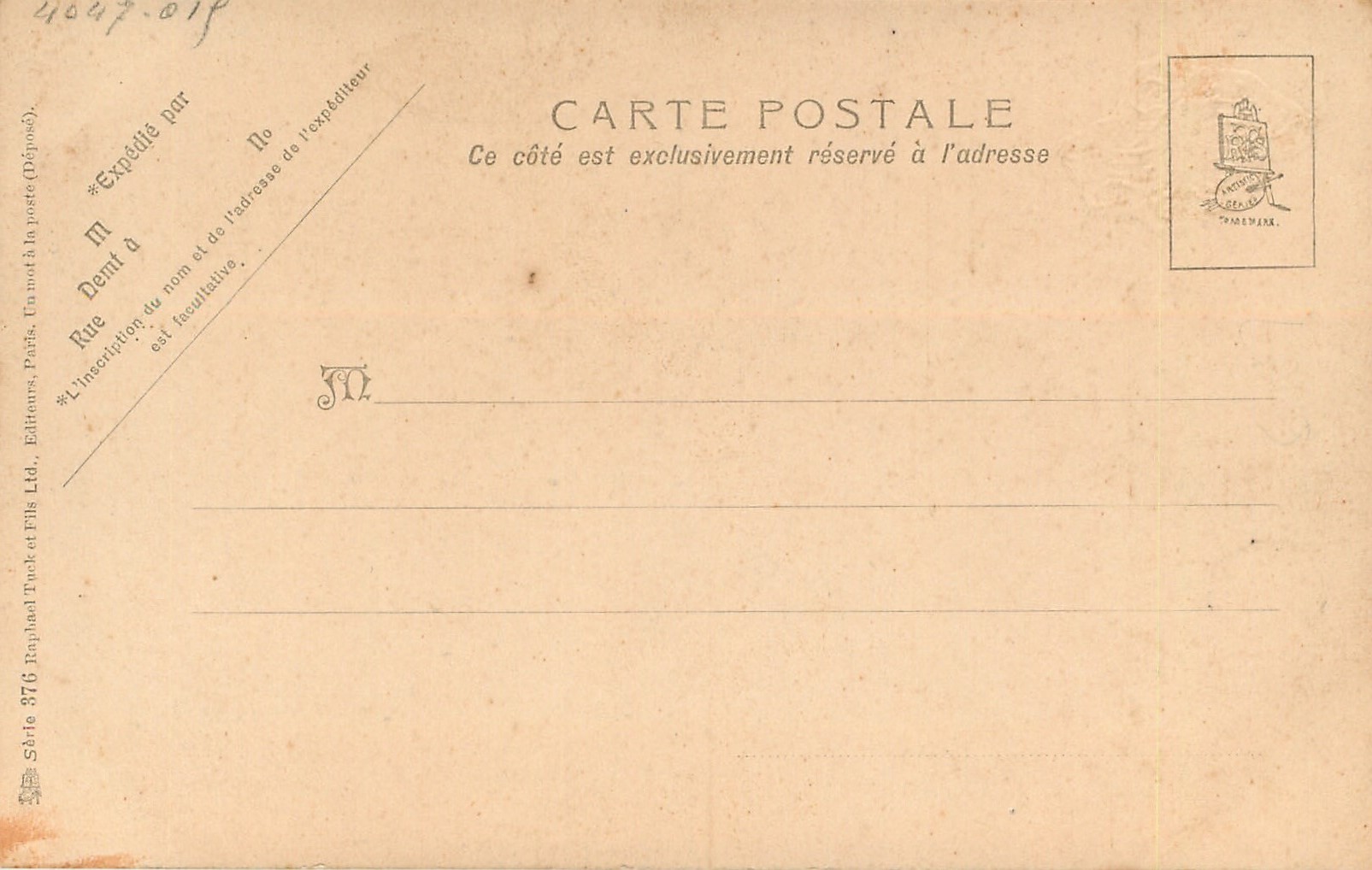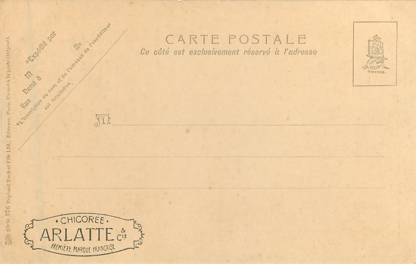 u/b, shades of grey or bistre, UN MOT A LA POSTE, (DEPOSE), pictures of sculptures to give 3-d effect, come with CHICOREE ARLATTE & CIE PREMIER MARQUE FRANCAIS advert. in grey on back