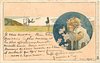 inset of mother & child looking over fence at rose,stylised rural scene behind, buff background