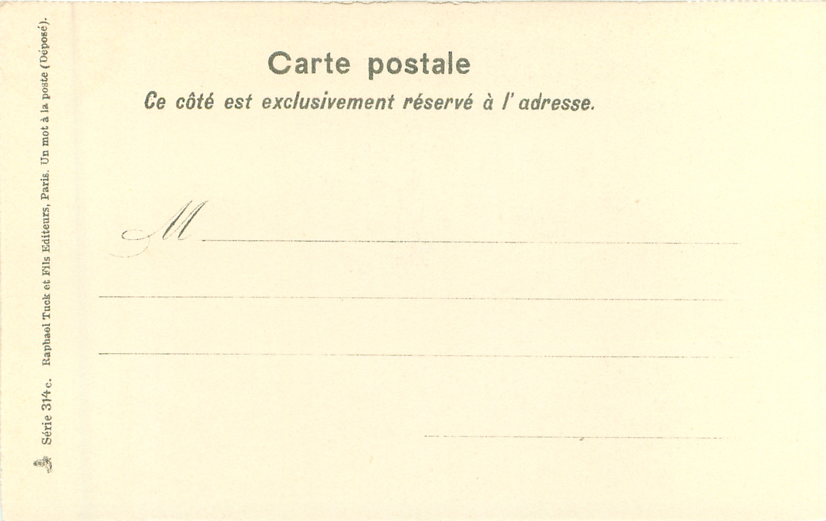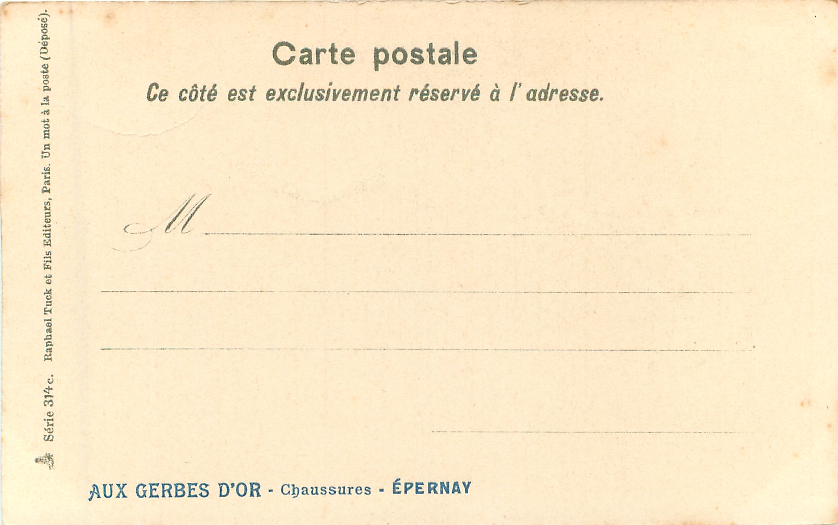 u/b, silver edges, come hand-coloured (with C suffix), UN MOT A LA POSTE, (DEPOSE), come opt. in blue on back AUX GERBES D'OR - CHAUSSURES - EPERNAY. come opt. top right front GILLET-LAFOND