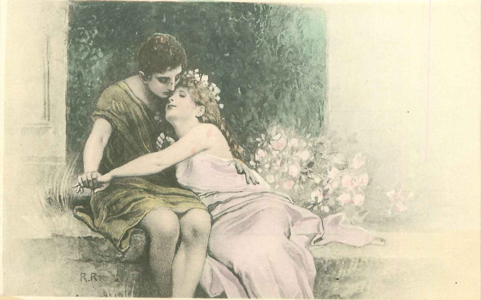 couple sit on stone wall, man left, woman right, they hold hands & look into each others eyes