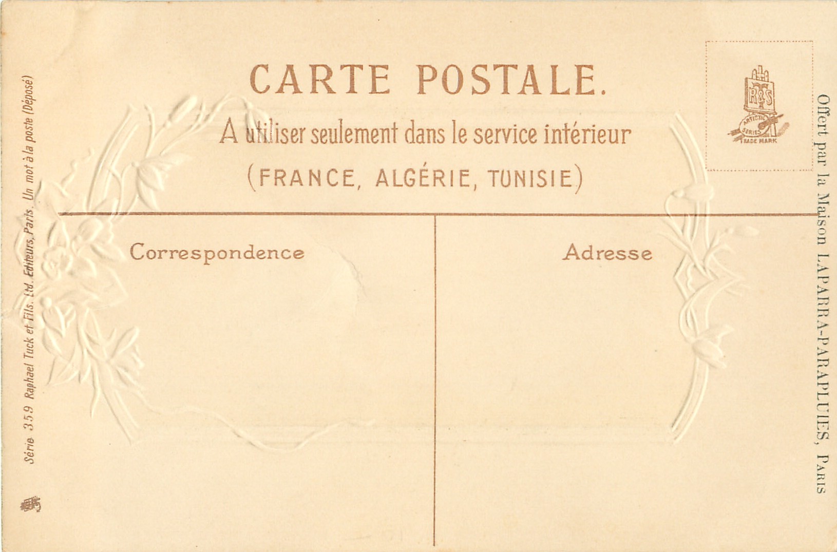 UN MOT A LA POSTE, (DEPOSE), gilt & silver embossing, come with A LA DAME BLANCHE in red on front, come with OFFERT PAR LA MAISON LAPARRA-PARAPLUIES, PARIS in black on back
