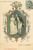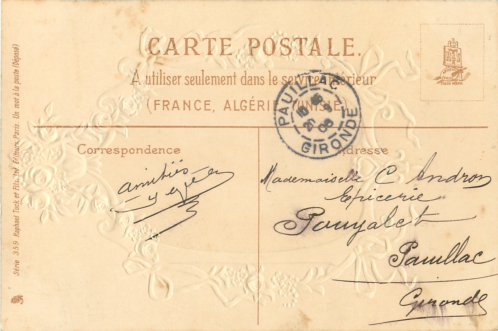 UN MOT A LA POSTE, (DEPOSE), gilt & silver embossing, come with A LA DAME BLANCHE in red on front, come with OFFERT PAR LA MAISON LAPARRA-PARAPLUIES, PARIS in black on back