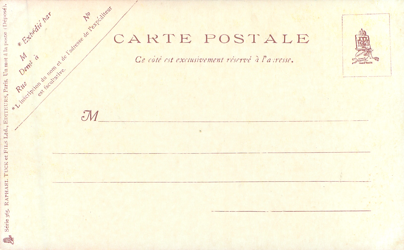 set titles from1904 list, packet of English backed cards u/b, UN MOT A LA POSTE, (DEPOSE), d/b RAPHAELETTE PAR VAN HIER (IMPRIME ANGLETERRE), same images, English backs CONNOISSEUR or OILETTE CONNOISSEUR 2576 & OILETTE 7154