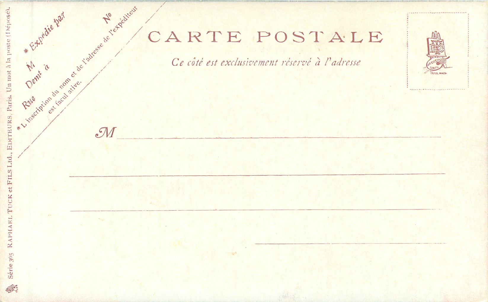 set titles from1904 list, packet of English backed cards u/b, UN MOT A LA POSTE, (DEPOSE), d/b RAPHAELETTE PAR VAN HIER (IMPRIME ANGLETERRE), same images, English backs CONNOISSEUR or OILETTE CONNOISSEUR 2576 & OILETTE 7154